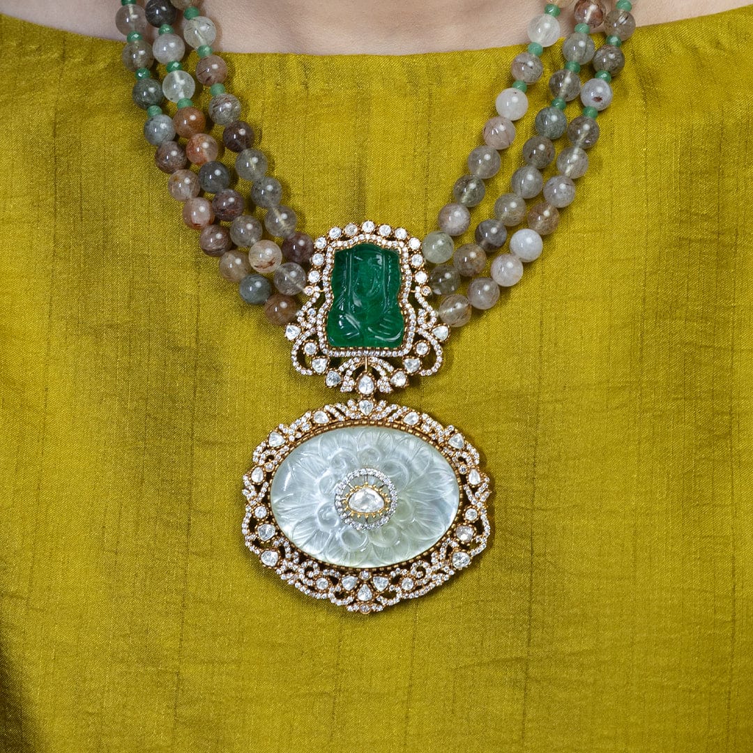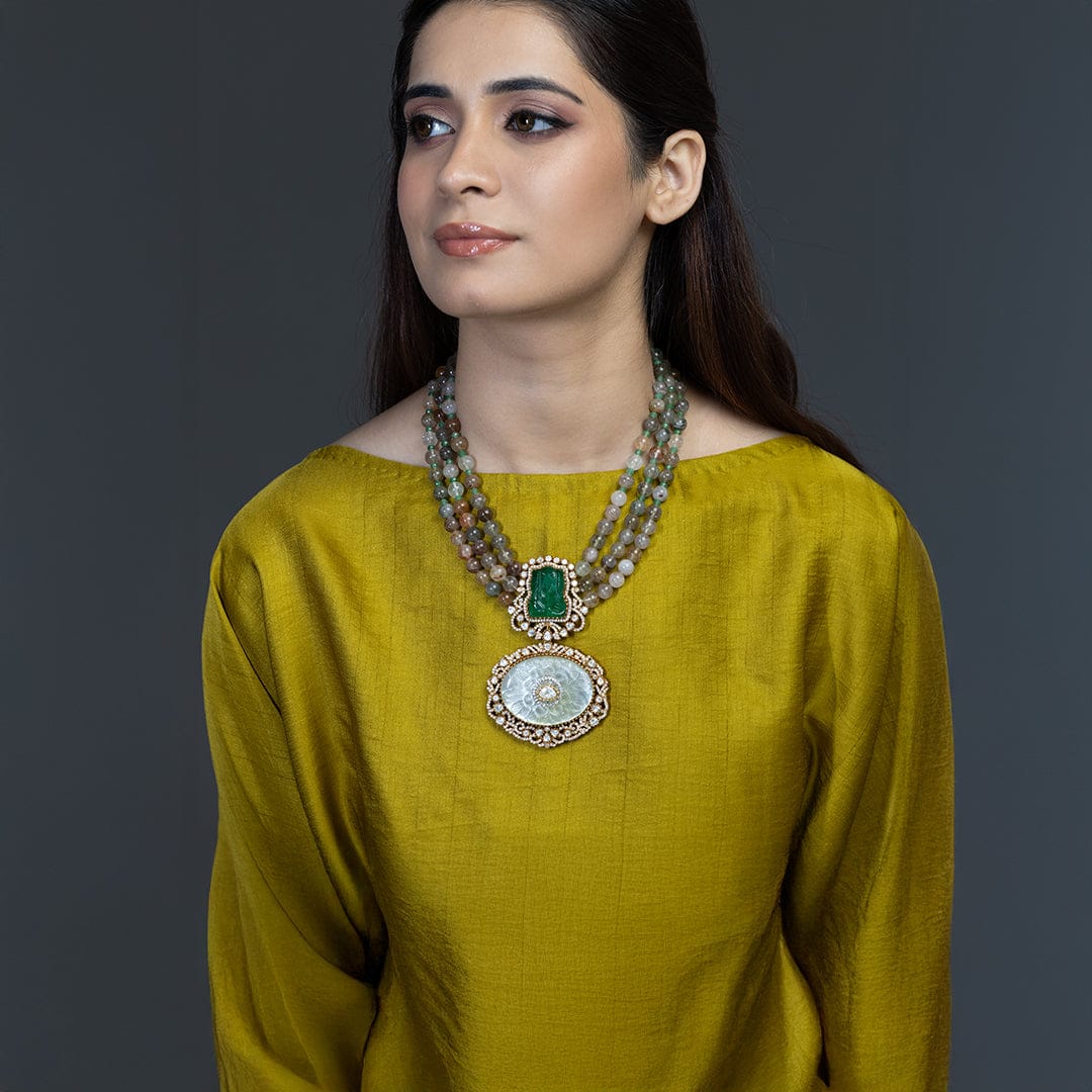 Description: This sophisticated necklace features three rows of earth-toned beads leading to a dual-layered pendant. It showcases a vibrant green center stone atop an ornate, shimmering medallion.