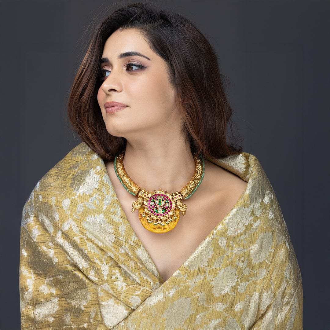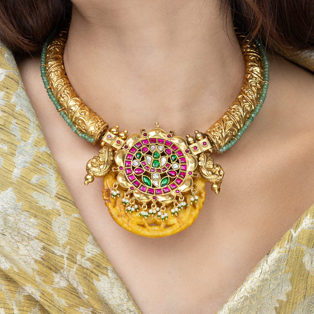 Description: A broad, floral-etched golden collar necklace is edged with green beads. Its circular centerpiece features vibrant pink and green stones with golden elephant accents.