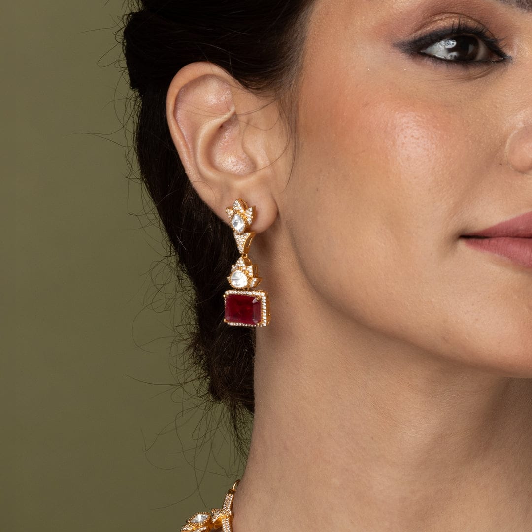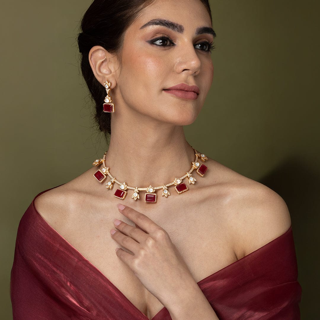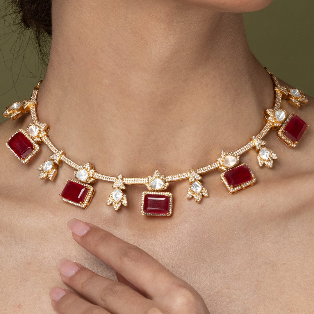 Description: Transform your attire instantly. Slip on this luxurious ruby-red and gold necklace set to bring an air of instant heritage and warmth to your presence, making every moment feel grand and memorable.