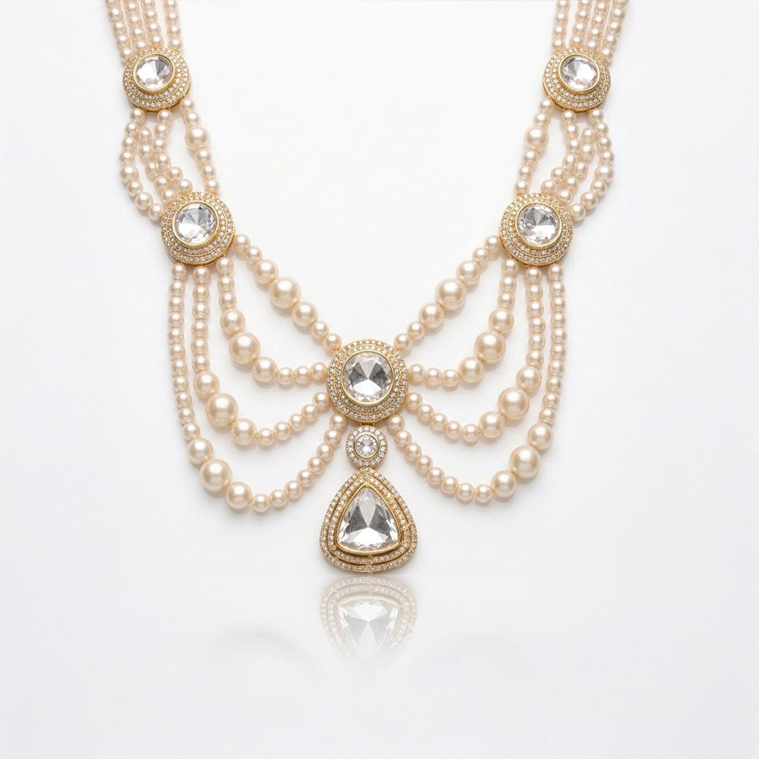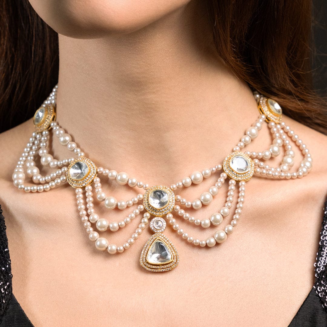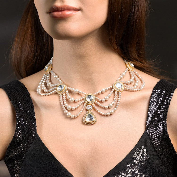 Description: An artful couture necklace captures graceful proportions and refined polish. styled with sarees, lehengas, and contemporary drapes.