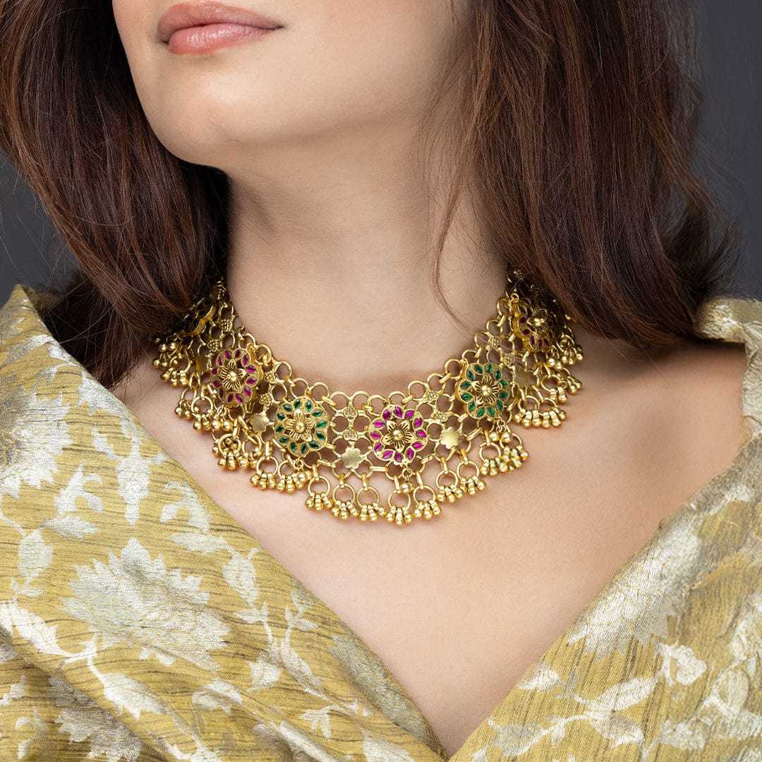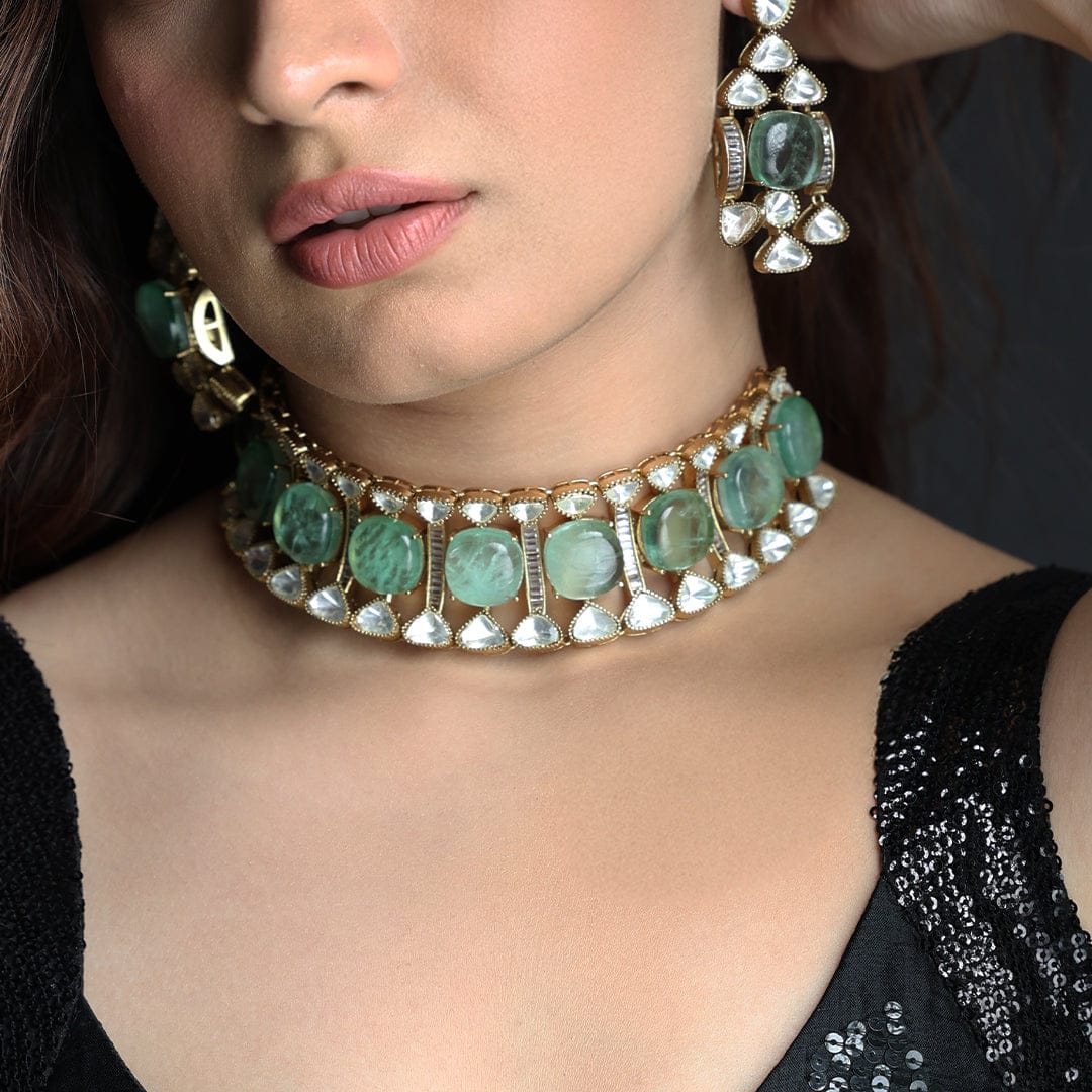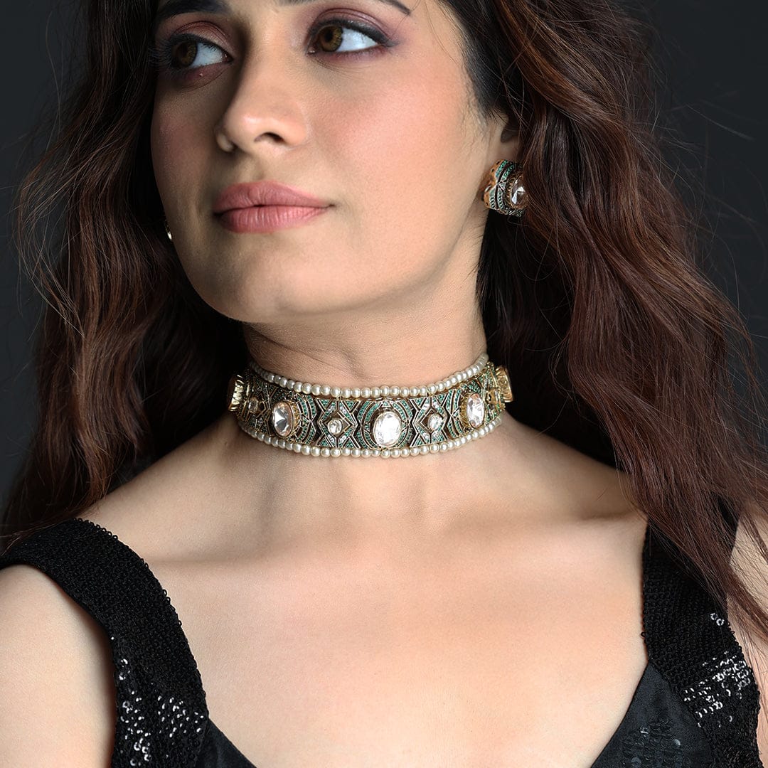 Add Floral green stone & Pearl Drop Choker Necklace Set to the cart