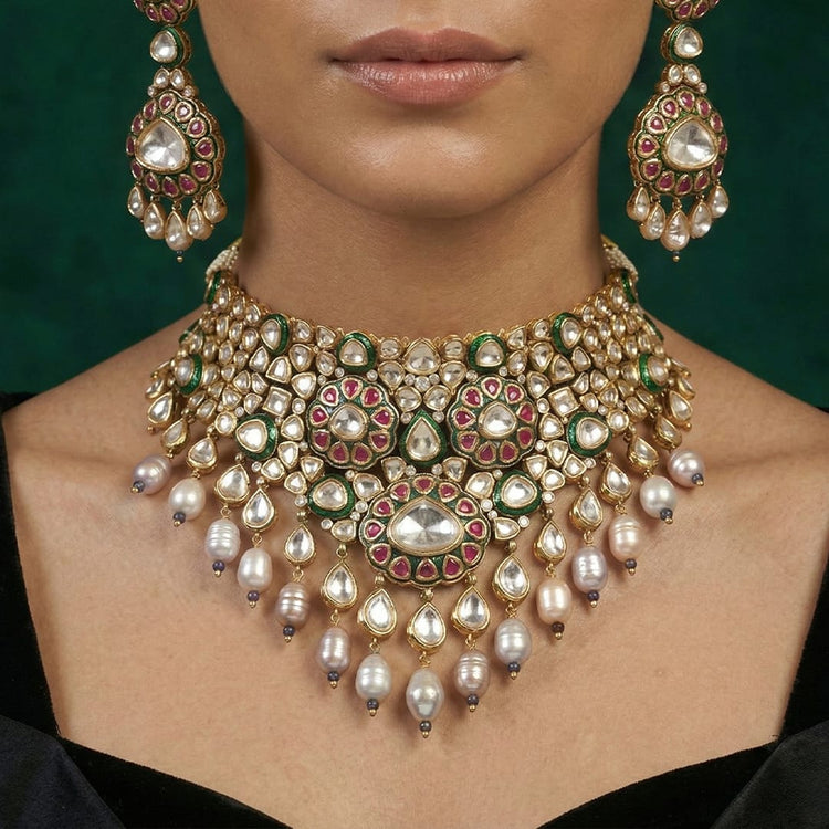 We use 22K Micron Gold Plating on brass, paired with high quality pearls, precious carved beads, semi precious stones, intricately hand painted with enamel, exquisite high quality pearls and high quality kundan that are celebrated for their durability and refinement - making every Joules by Radhika creation a piece that radiates brilliance and sophistication.