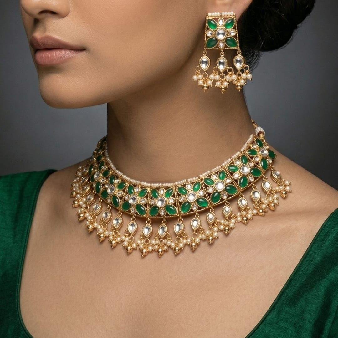Description:A premium handcrafted jewellery piece with luminous detailing and graceful craftsmanship, designed to elevate both Indian and fusion ensembles.