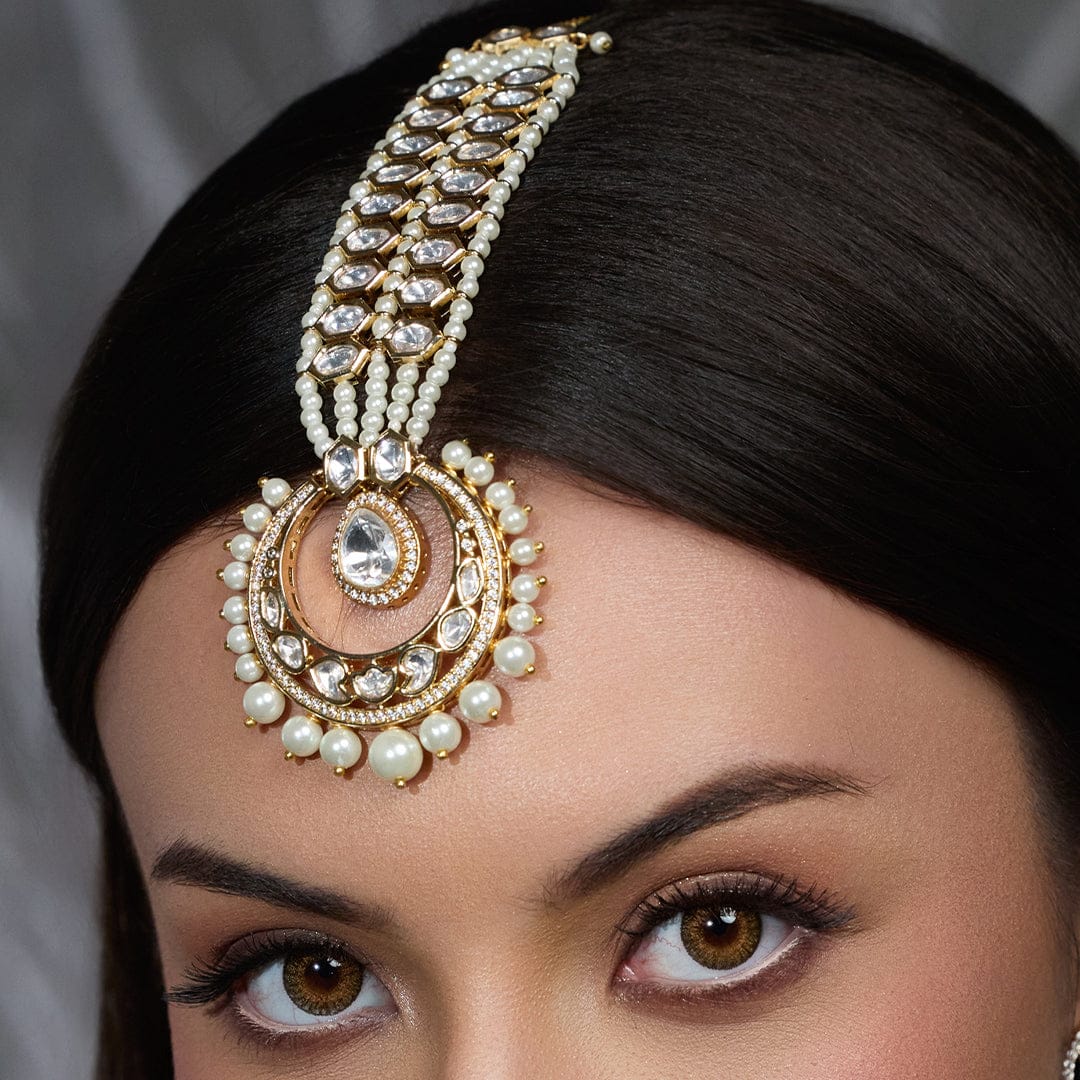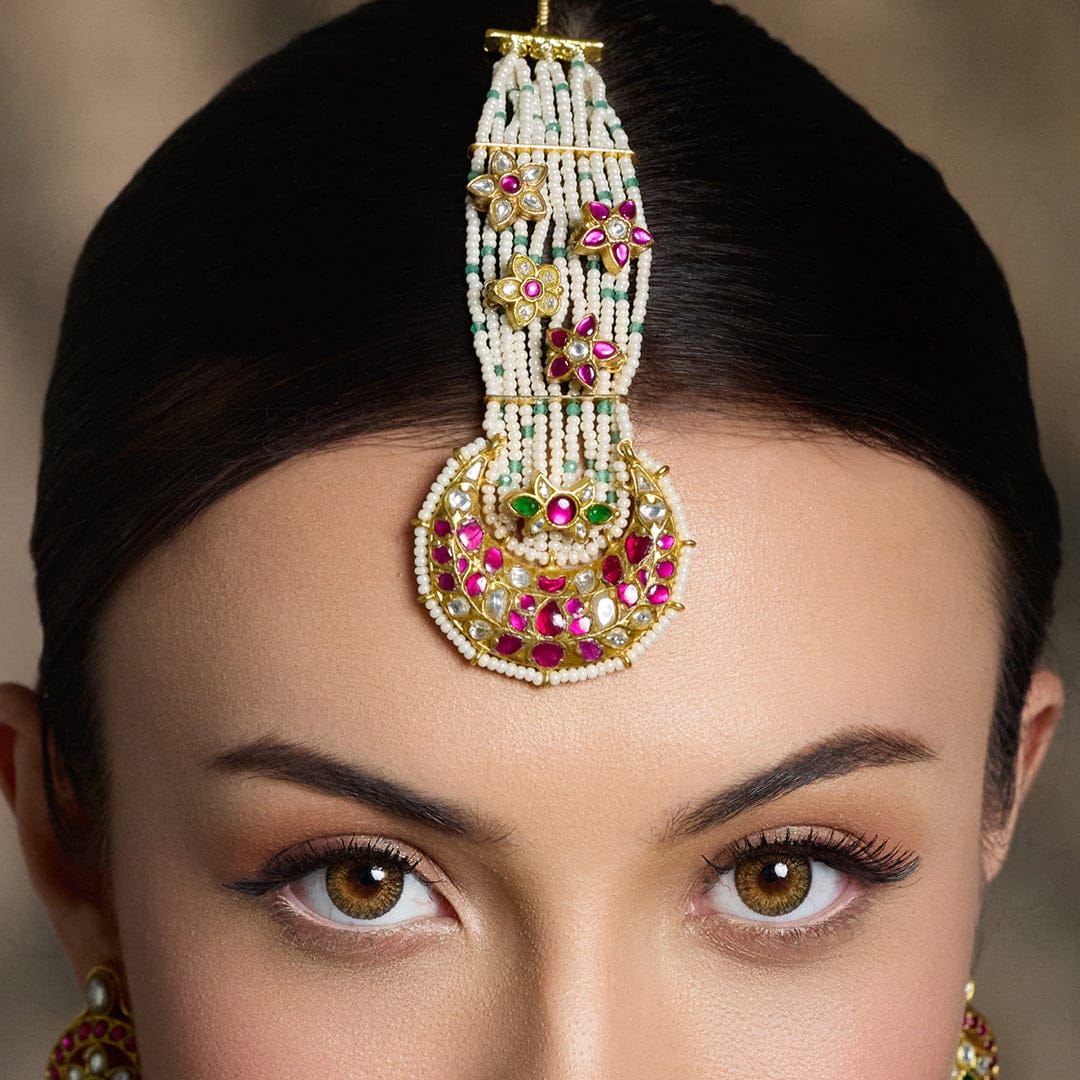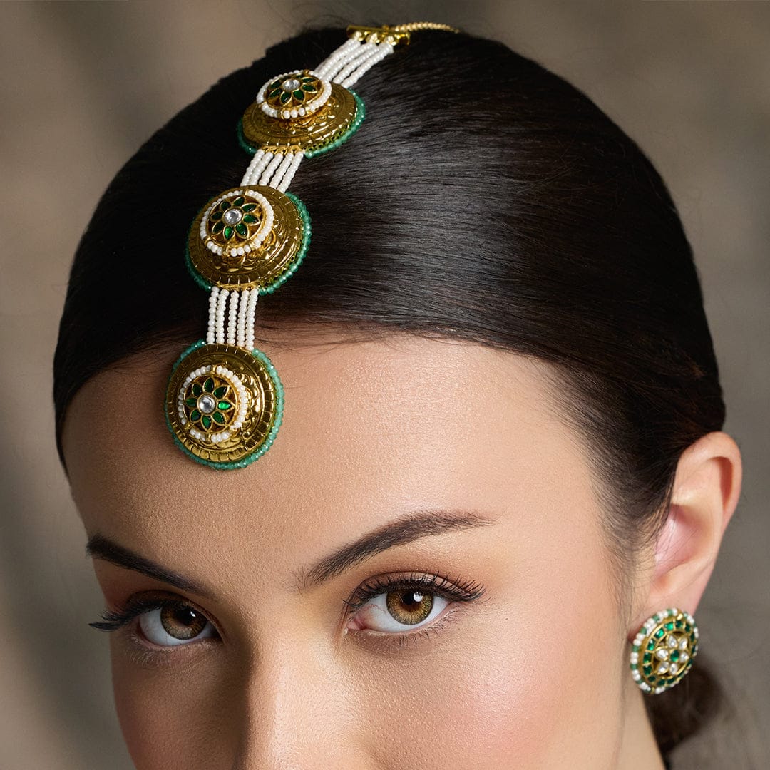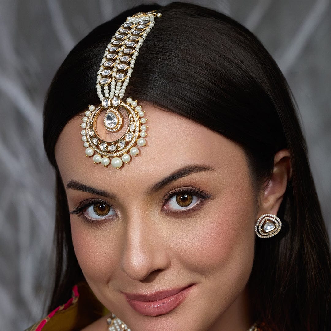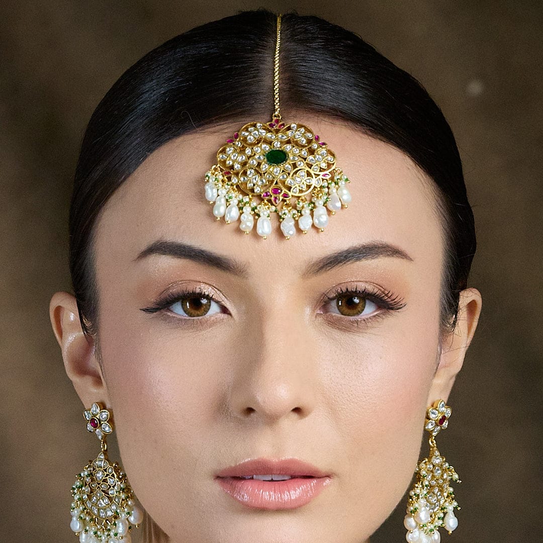The kundan maang tikka is a legacy of royalty. Featuring polished gemstones set in rich gold frames, it adds a majestic flair to any look. Kundan tikkas are perfect for North Indian weddings, pre-wedding shoots, and destination events. It should be paired with matching kundan chandbalis for a statement bridal look.
