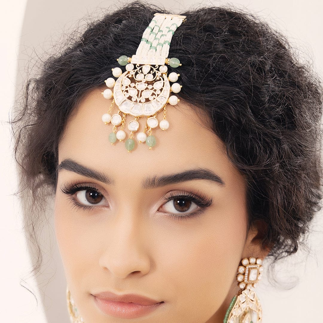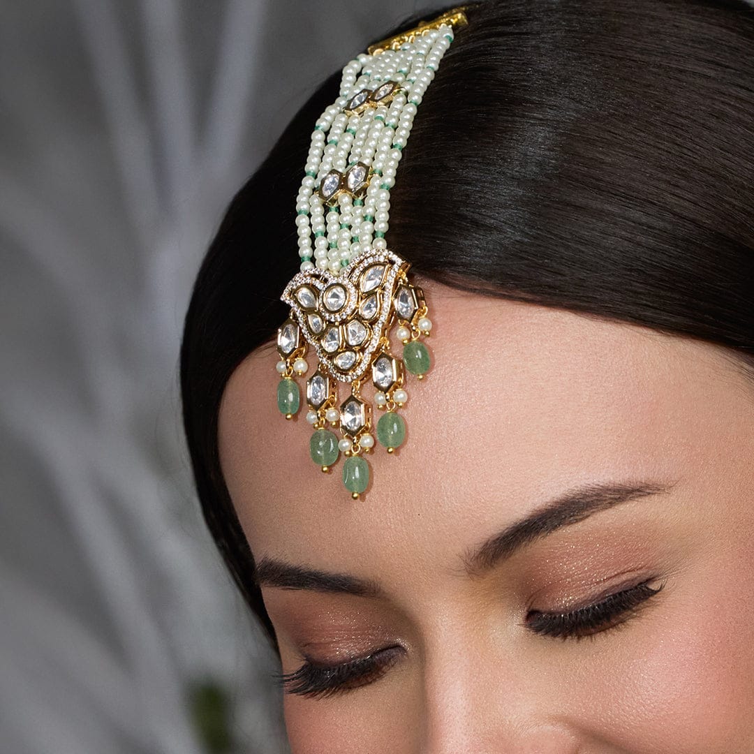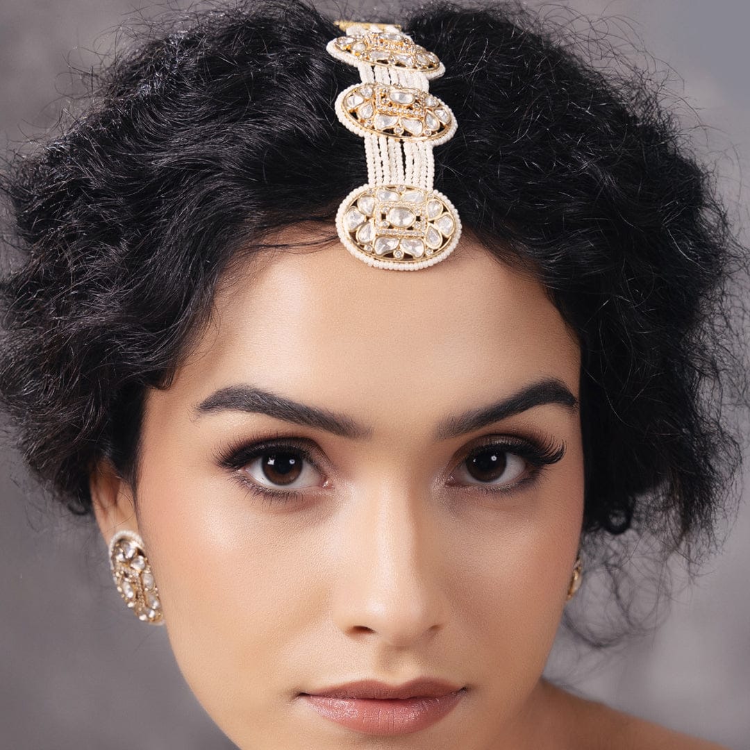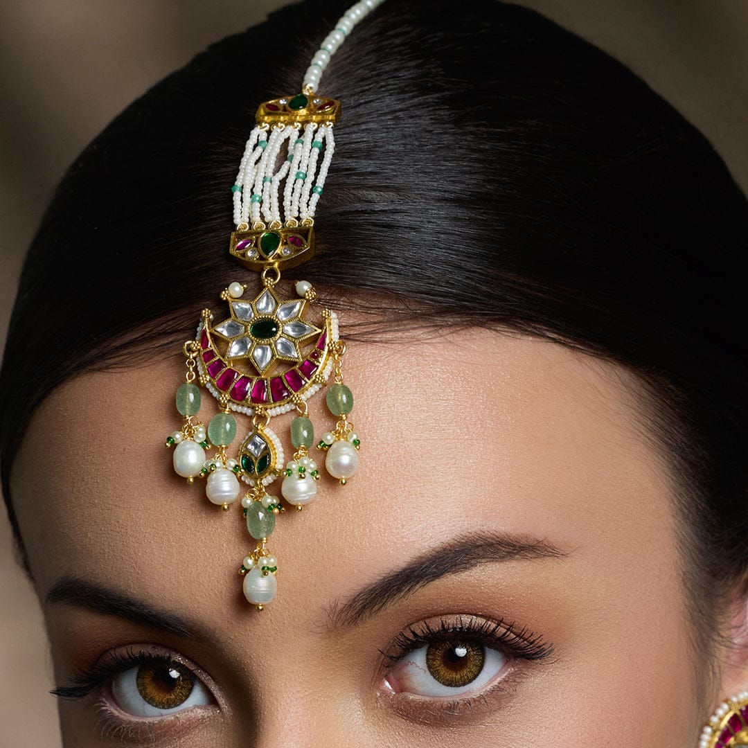 The kundan maang tikka is a legacy of royalty. Featuring polished gemstones set in rich gold frames, it adds a majestic flair to any look. Kundan tikkas are perfect for North Indian weddings, pre-wedding shoots, and destination events. It should be paired with matching kundan chandbalis for a statement bridal look.