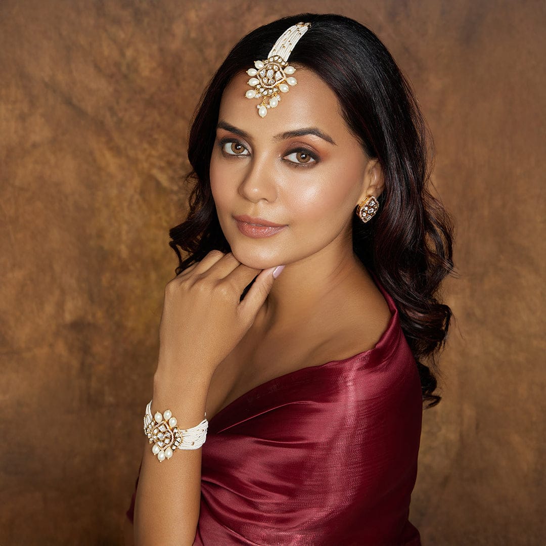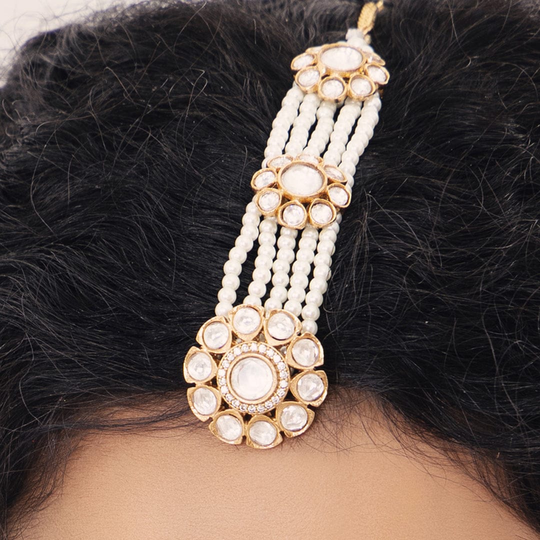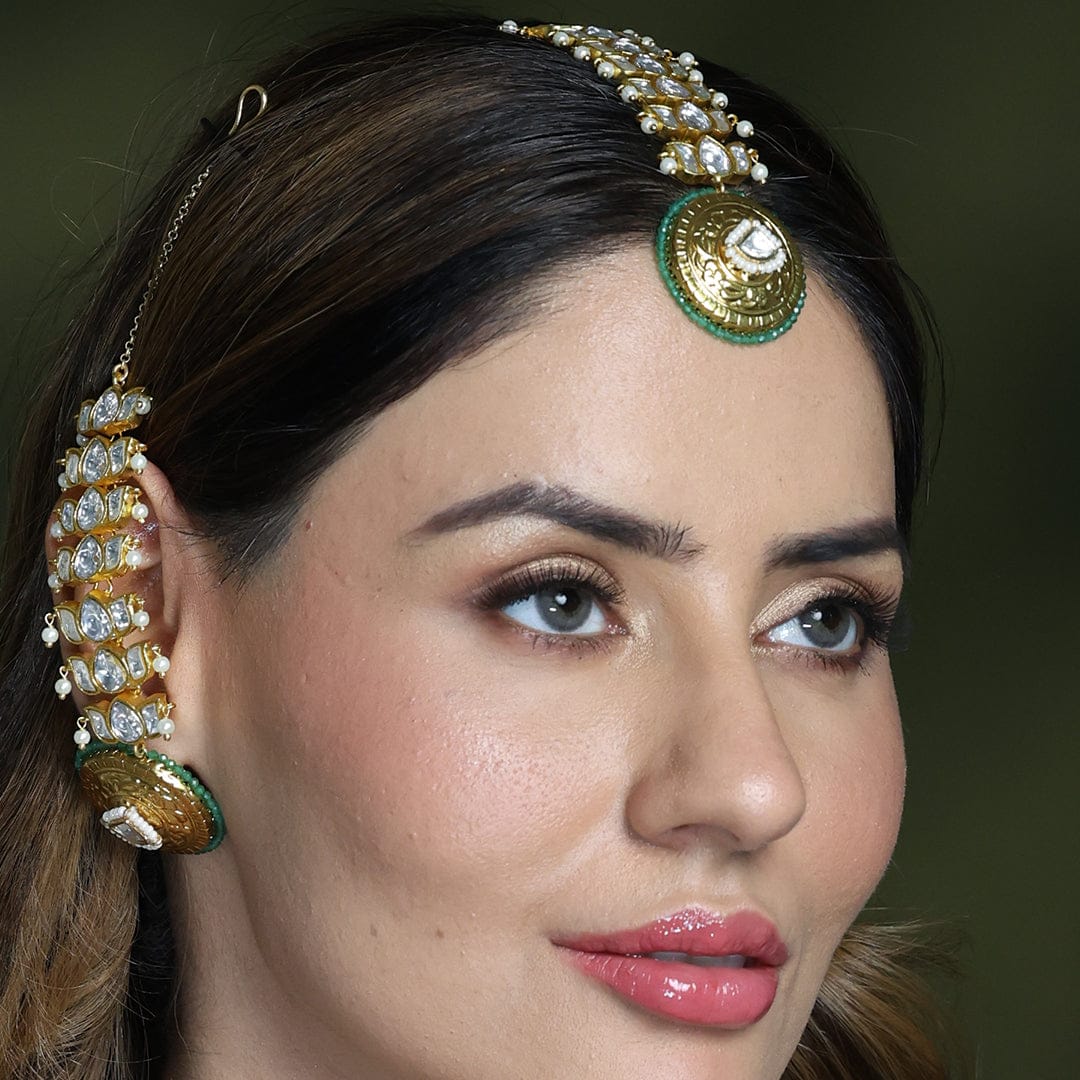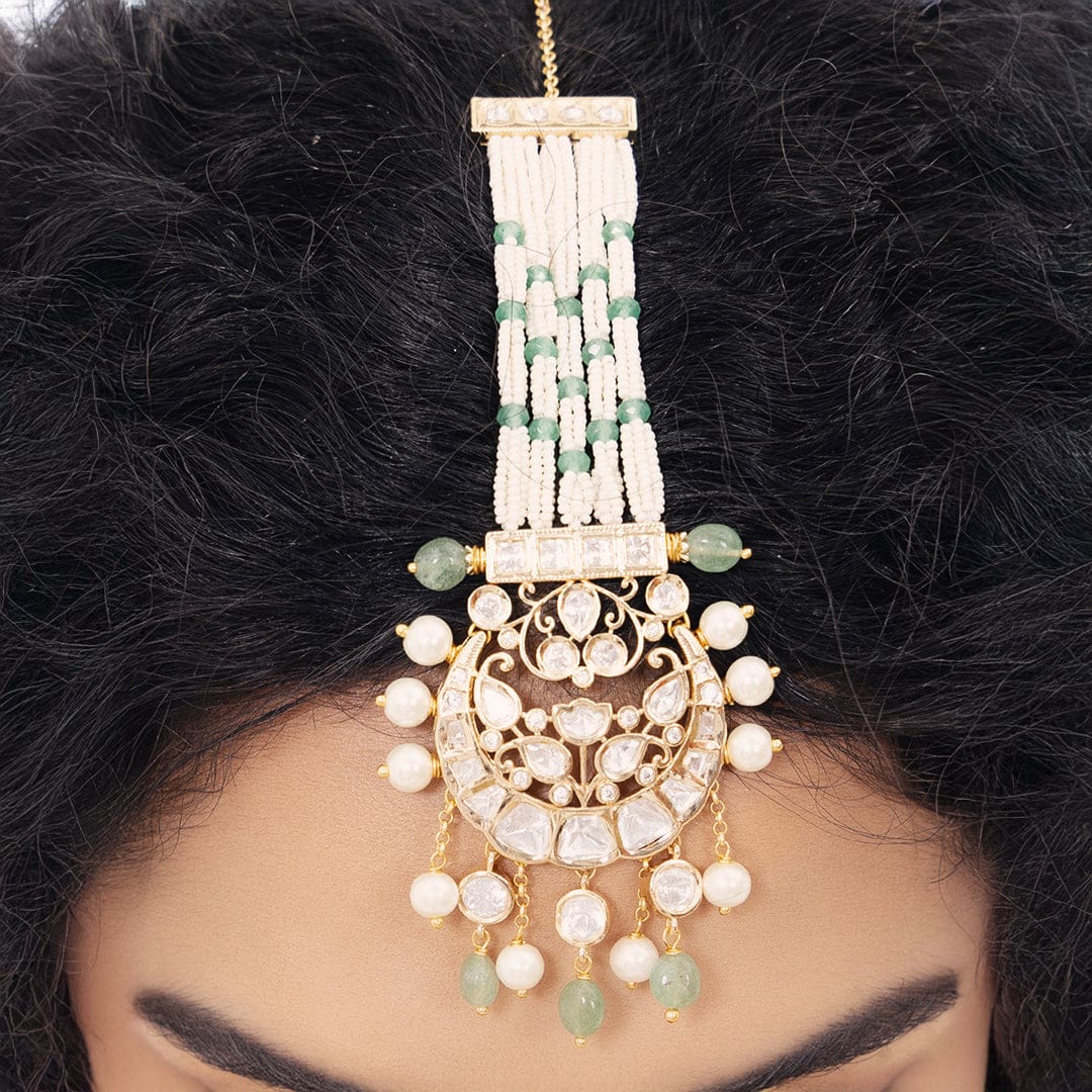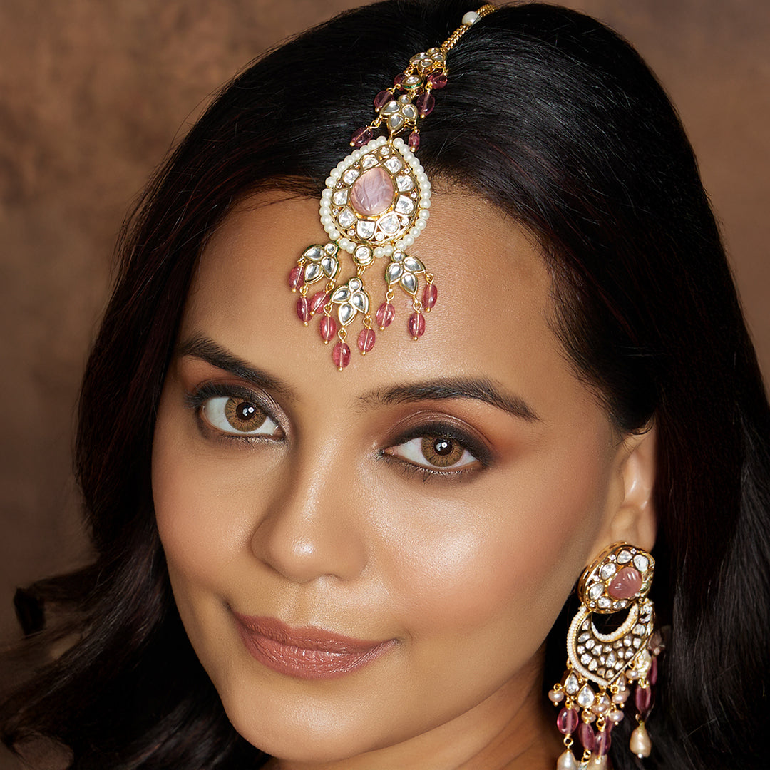 The kundan maang tikka is a legacy of royalty. Featuring polished gemstones set in rich gold frames, it adds a majestic flair to any look. Kundan tikkas are perfect for North Indian weddings, pre-wedding shoots, and destination events. It should be paired with matching kundan chandbalis for a statement bridal look.