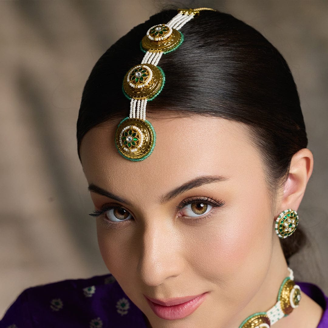 Pachi Gold Maang Tikka – Known for its embossed floral patterns and uncut stones