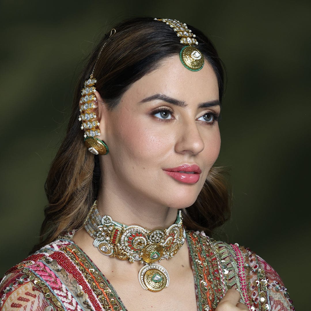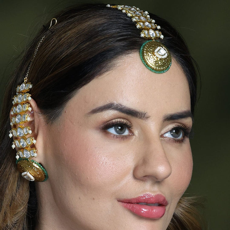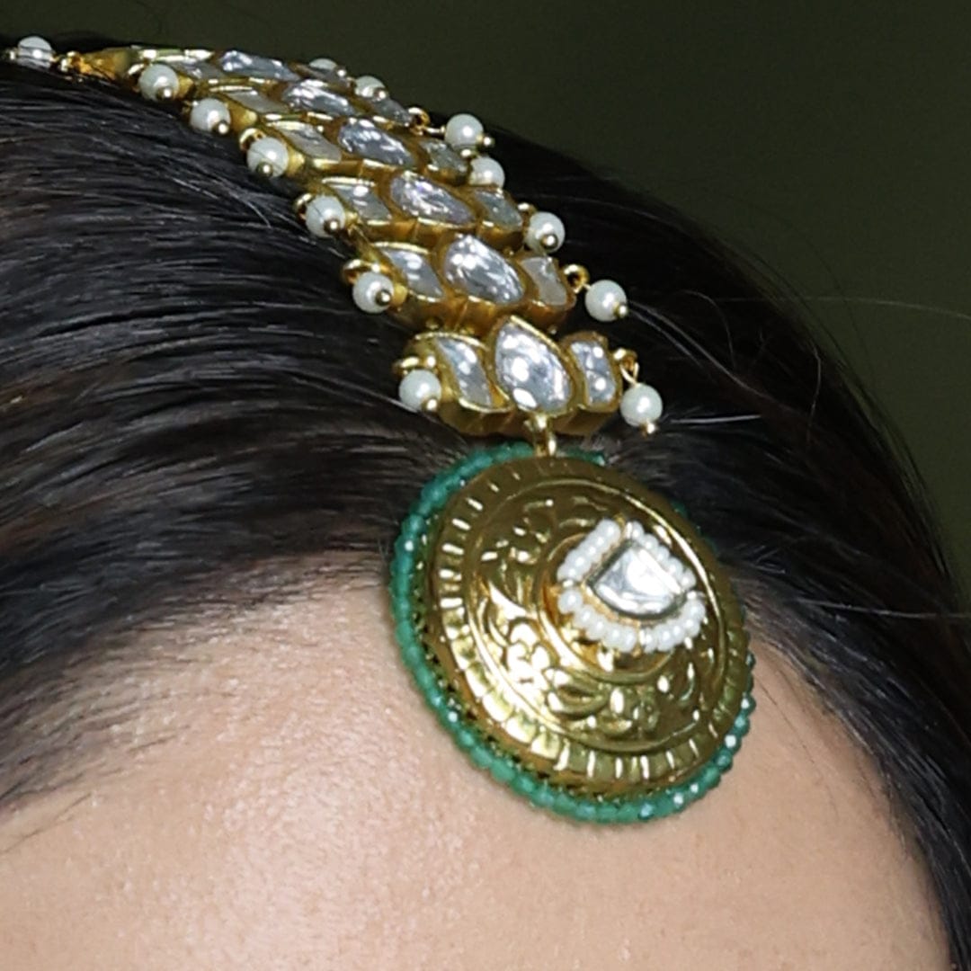 Description: Add a royal touch to your traditional look with this Rajsi Radiance Maang Tikka. Crafted with shimmering stones set in a golden framework, it features a stunning green enamel base with an intricate floral design at the centre. Perfect for weddings, festive occasions, and cultural celebrations.