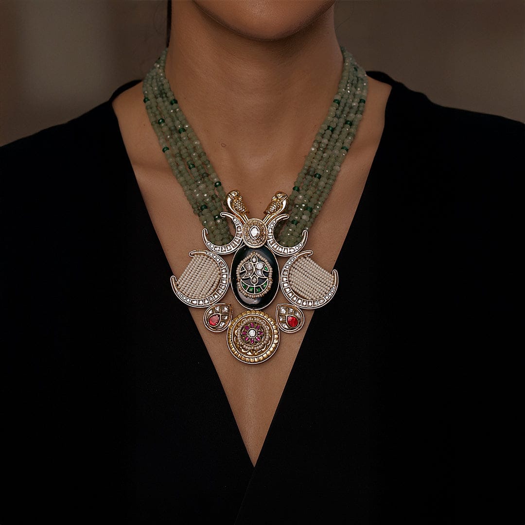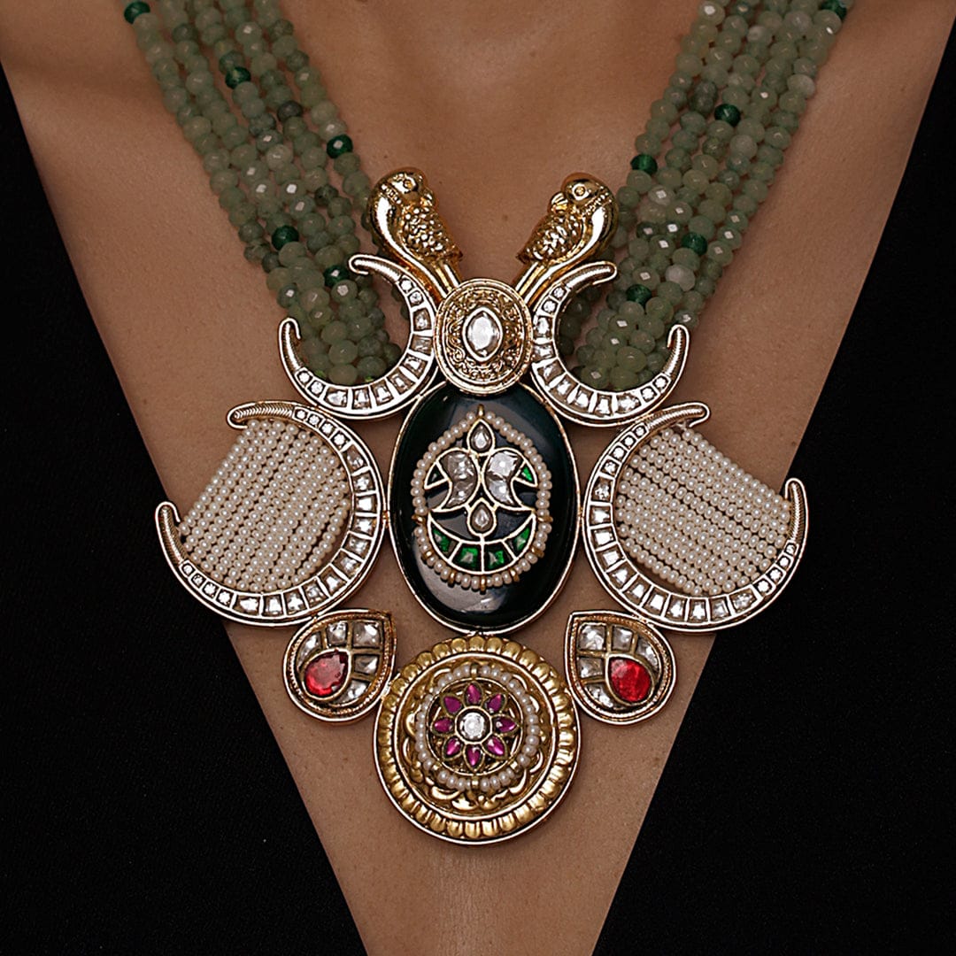 Description: Bespoke necklace captures attention with its fusion of various beads, embellishments, pearls, and stones, all highlighted by a bold statement pendant. Its design ensures you'll stand out with elegance and flair.