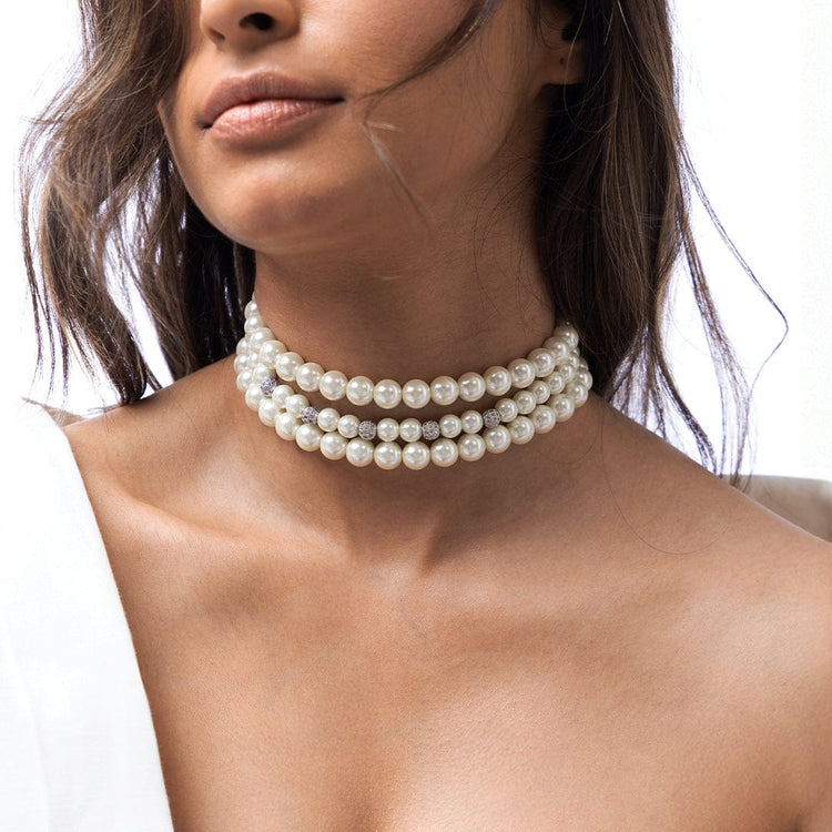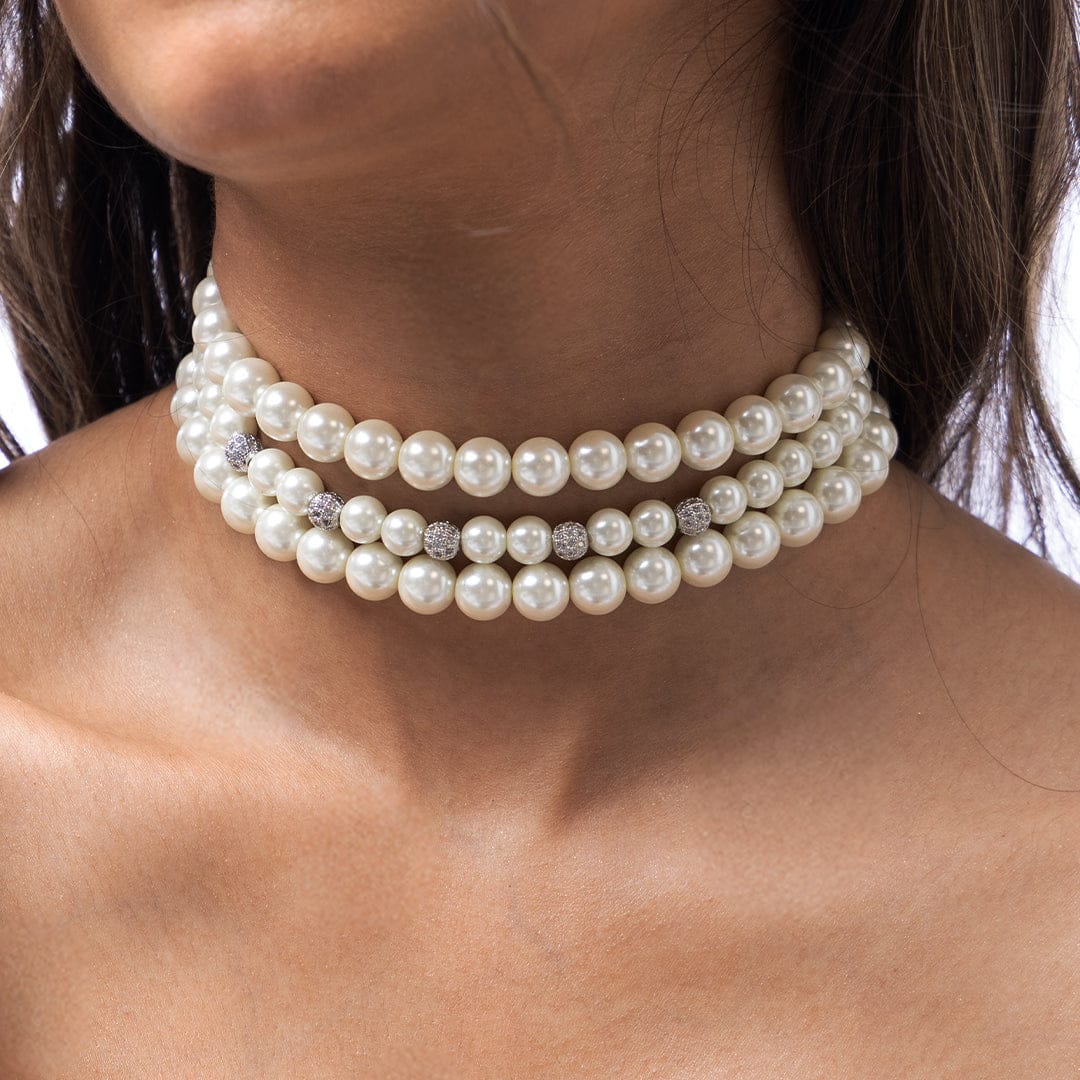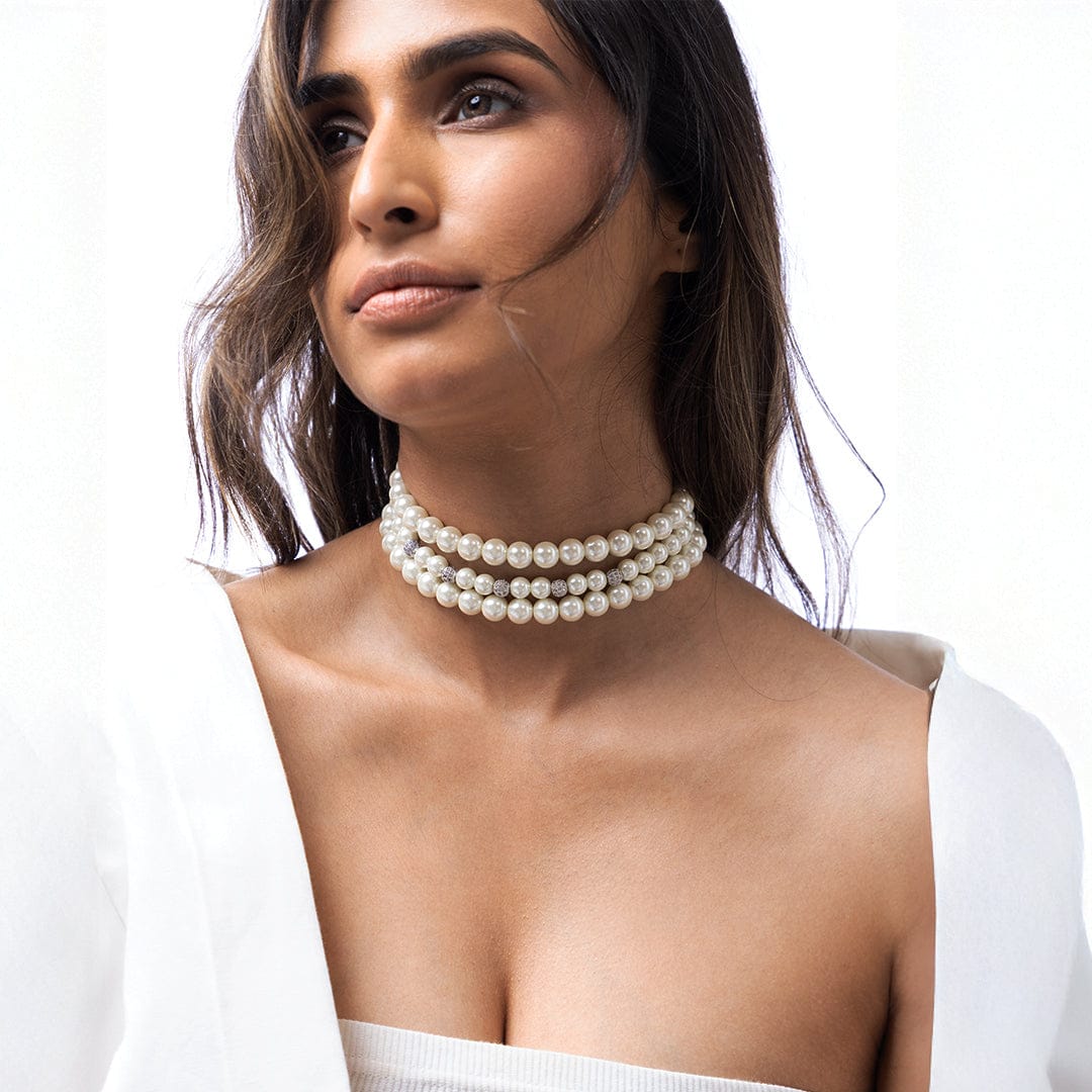 Description: This classic Indian Jewellery necklace features three magnificent strands of white pearls. The varying sizes of the pearls enhance the necklace's elegant design from Ahaanya.