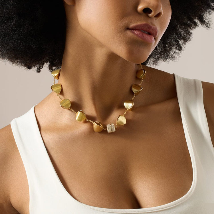 Description: The Doreya Necklace reflects the timeless shine of sculpted gold. Its bold, curved forms are cast in a luminous finish that catches light with every turn. Closed with a magnetic clasp, it brings structure and softness to any styling. It is hand-finished with subtle variation, giving the piece a clean yet organic rhythm.