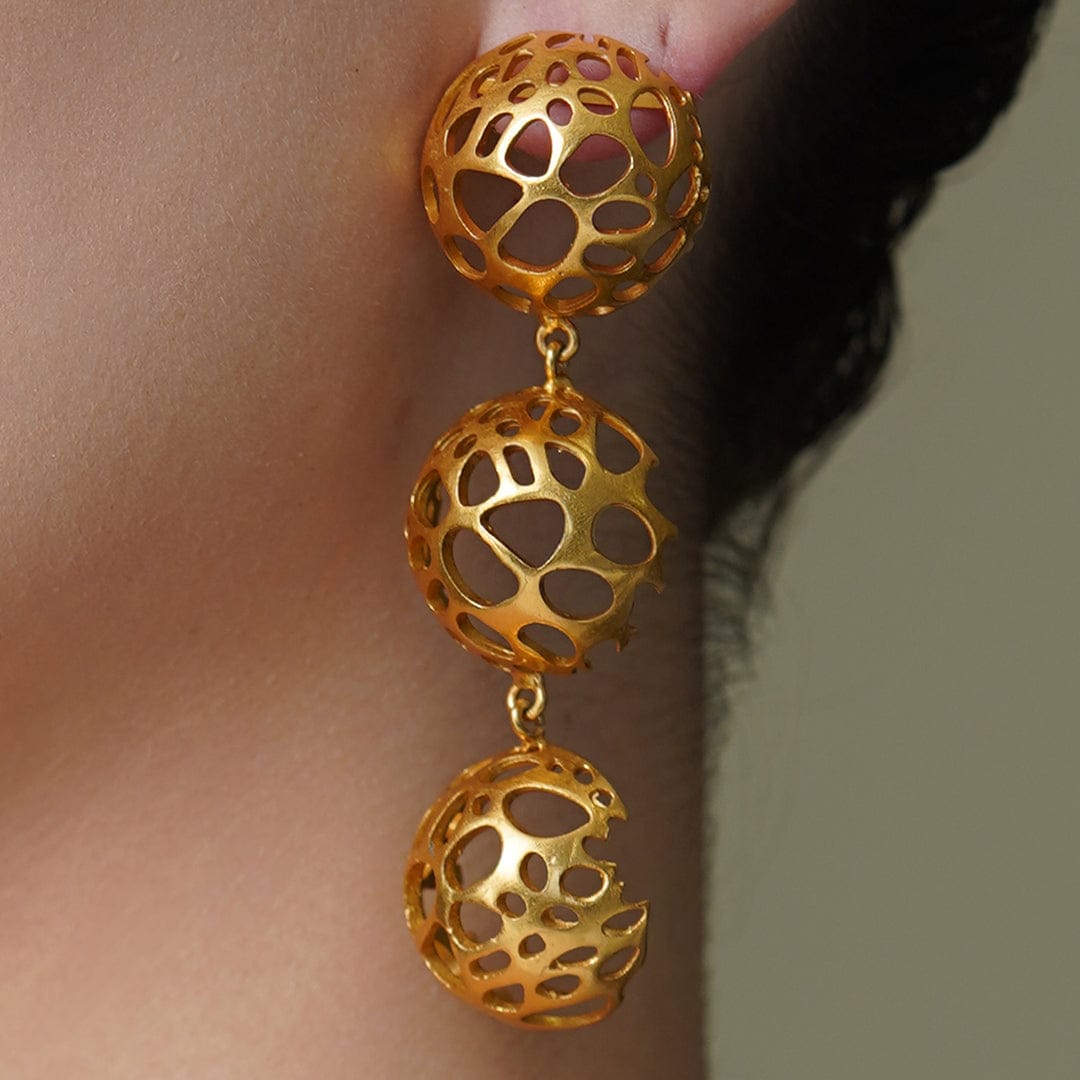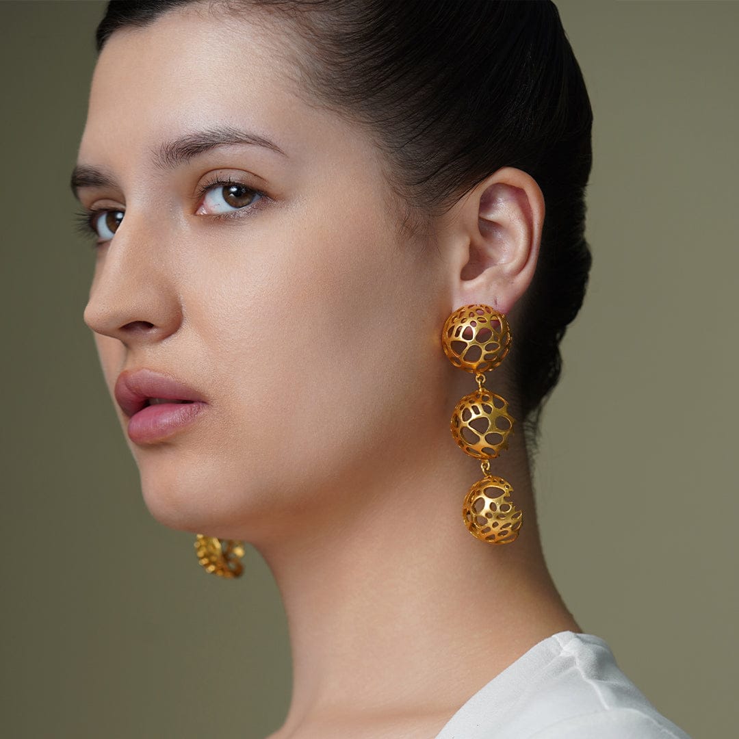 Description: Shine bright with Golden Hive Dangler Earrings. Bold and stylish Dangler Earrings are are perfect for adding golden elegance to both casual and festive looks.