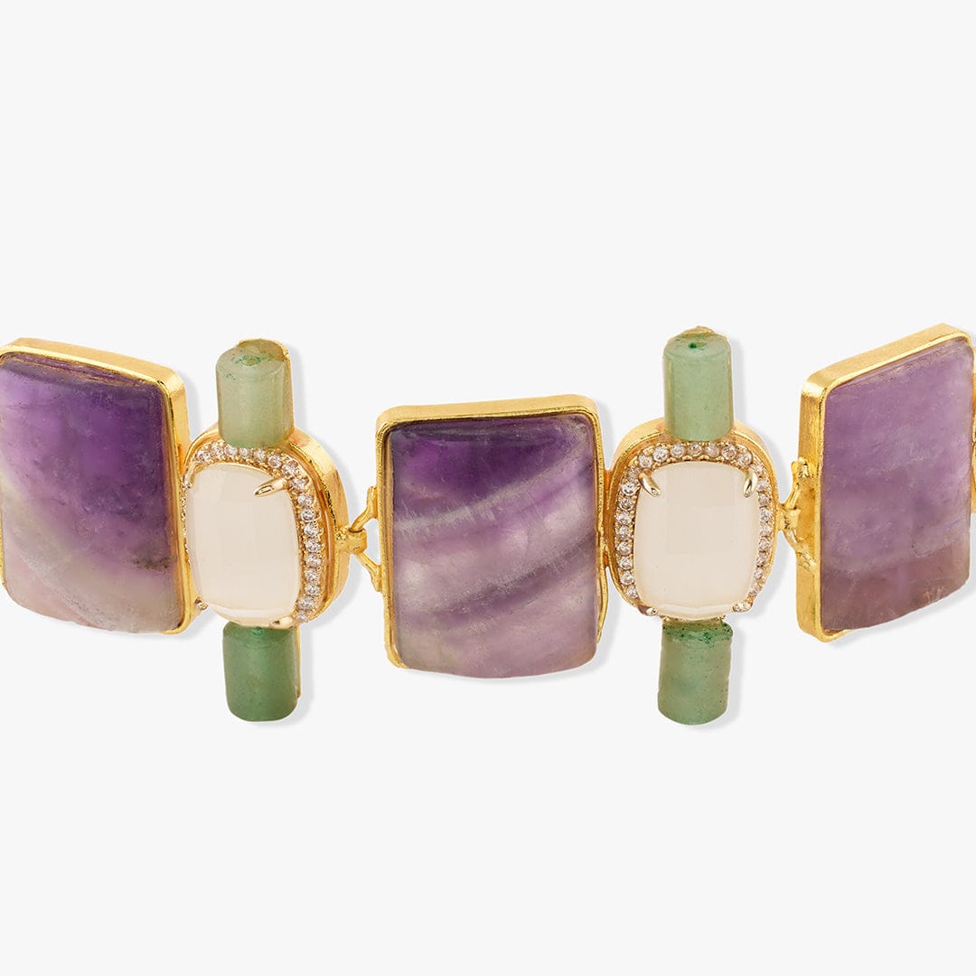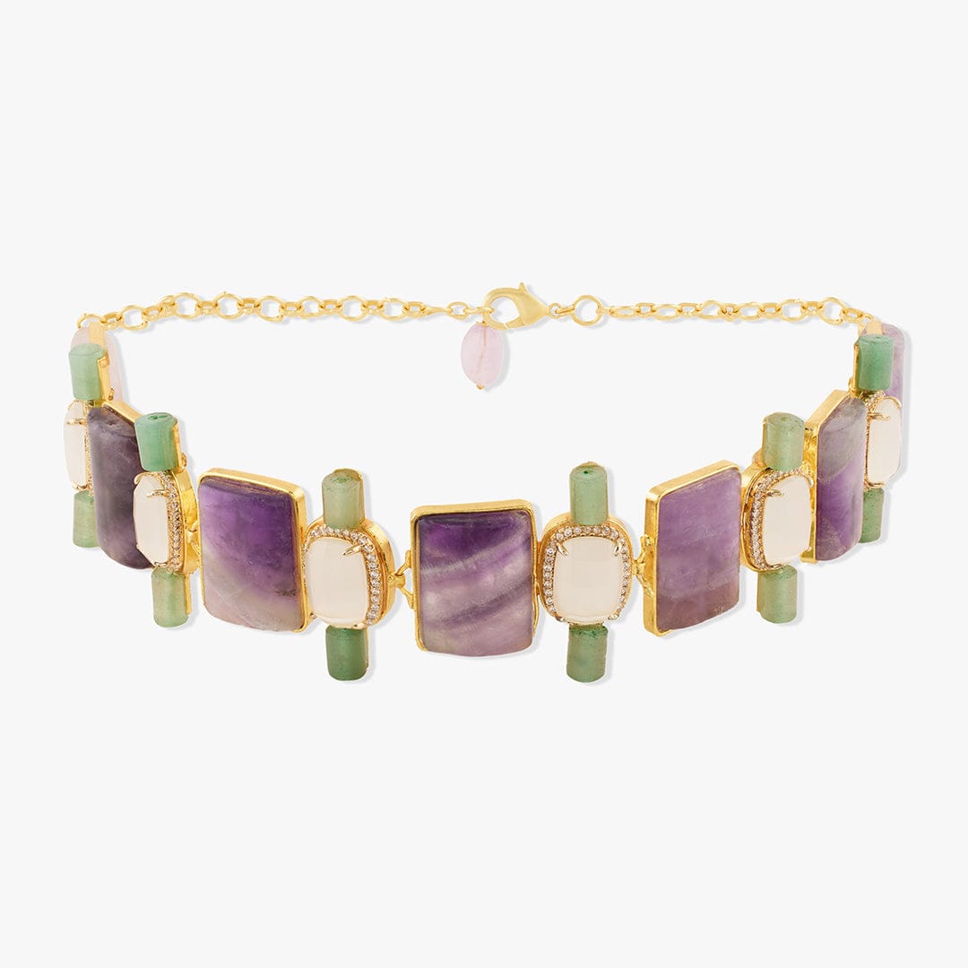 Description: The Xelene Choker mirrors the calm glow of dusk across amethyst skies. It features richly colored purple agate stones set along a structured gold-toned band. Finished with a lobster clasp, it adds refined boldness with a celestial touch. The stones are naturally varied, giving each choker a quiet rhythm of shape and tone.