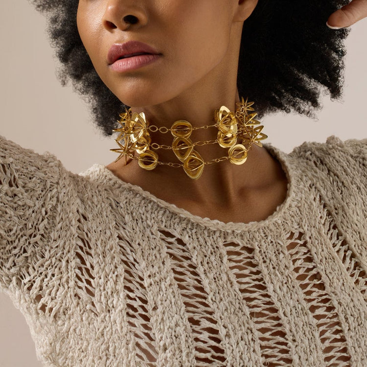 Description: The Zyra Choker draws inspiration from the untamed beauty of wild florals cast in gold. Designed to make a bold yet refined statement, it features sculptural gold-toned blooms arranged on a structured band that sits gracefully at the collarbone. A striking accent for both modern and classic looks. Every floral element tells its own story, adding character and charm to the piece.