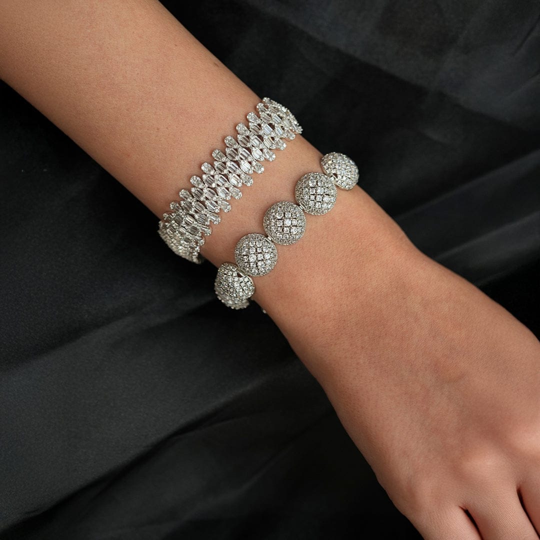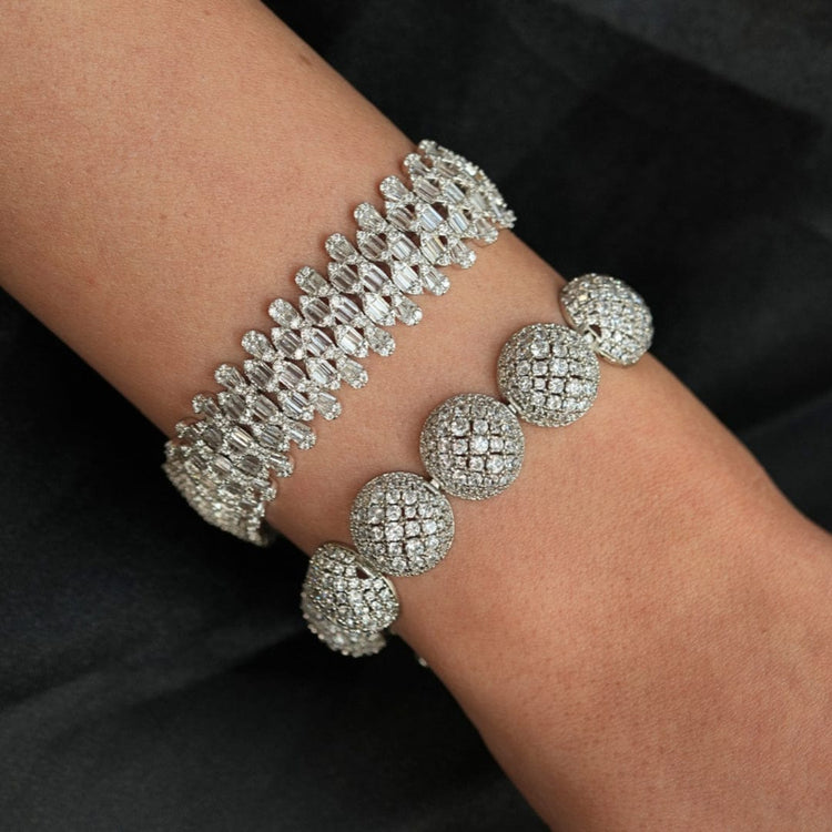 Description : A sleek silver bracelet featuring round dome loops, each set with sparkling faux diamonds. The design combines modern elegance with a touch of luxury, making it an ideal statement piece for any occasion.