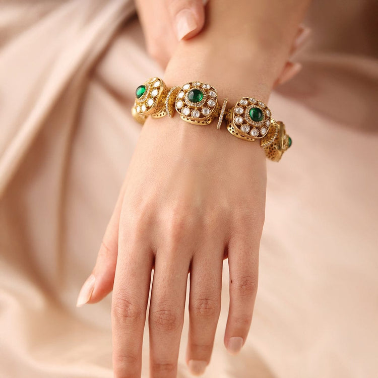 We use 22K Micron Gold Plating on brass, paired with high quality pearls, precious carved beads, semi precious stones, intricately hand painted with enamel, exquisite high quality pearls and high quality kundan that are celebrated for their durability and refinement - making every Joules by Radhika creation a piece that radiates brilliance and sophistication.