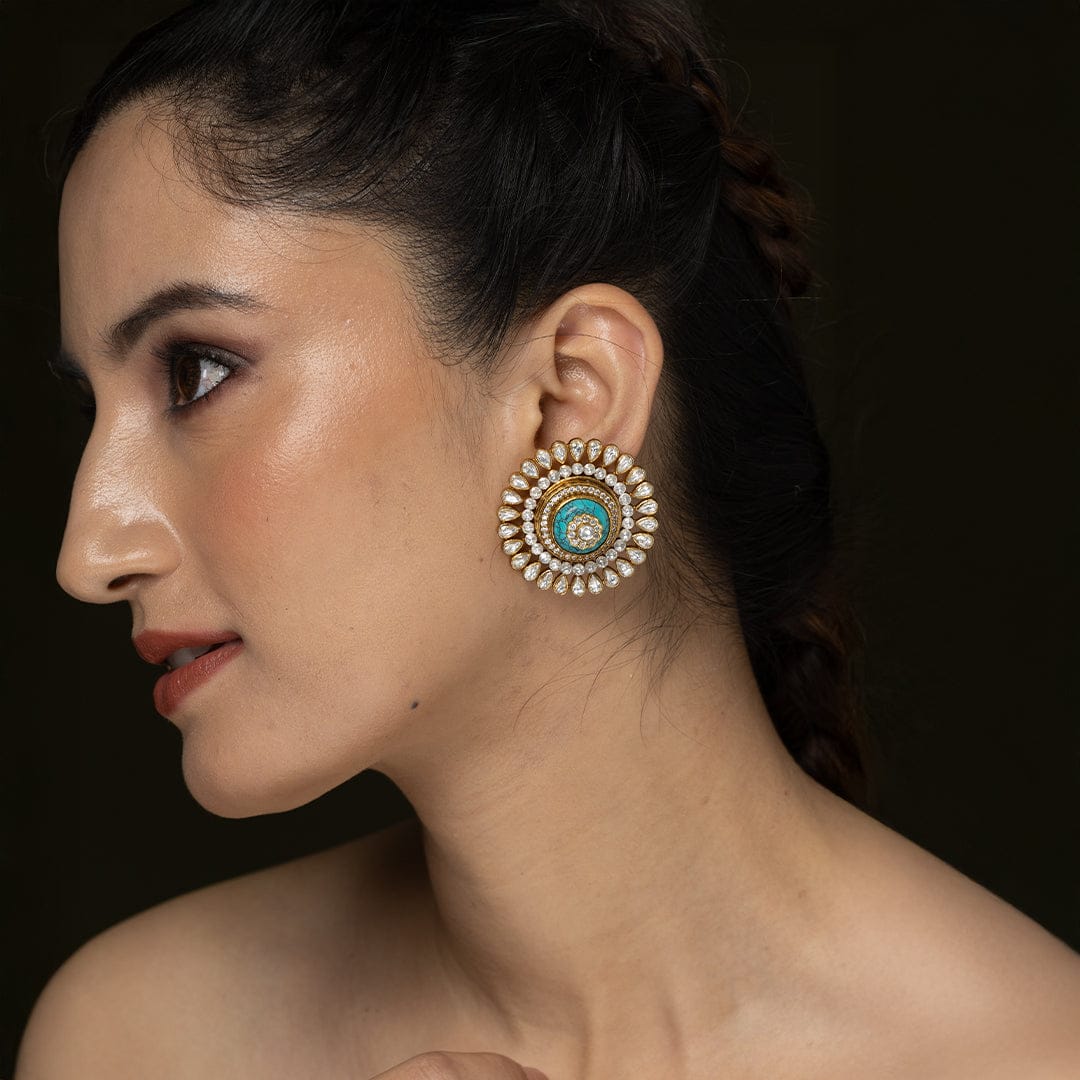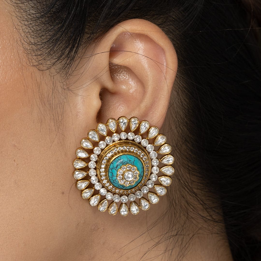 Description: Striking circular stud earrings with a vibrant aqua center stone encircled by layers of intricate metalwork and radiant clear embellishments. These unique studs are perfect for a memorable gift.