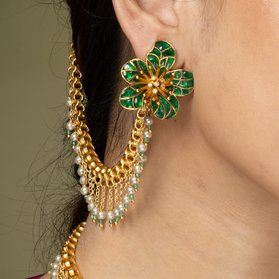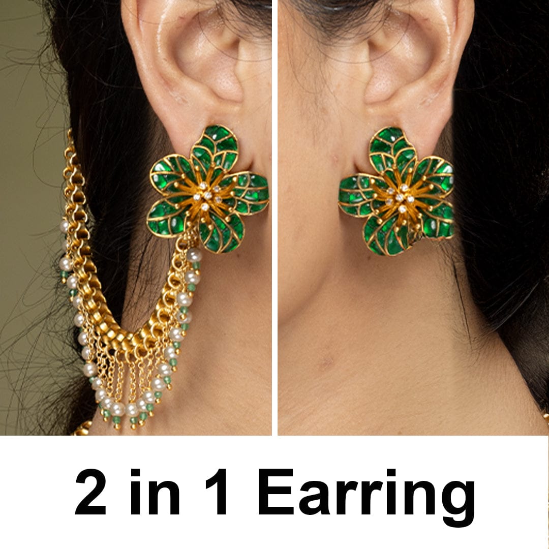 Description: This beautiful, changeable ear chain showcases luminous pearls suspended below lovely green flower motifs. Earring can be worn in 2 ways, with & without the motif drops for different occassions. Its versatile function allows effortless styling, making it an exceptional and memorable gift.