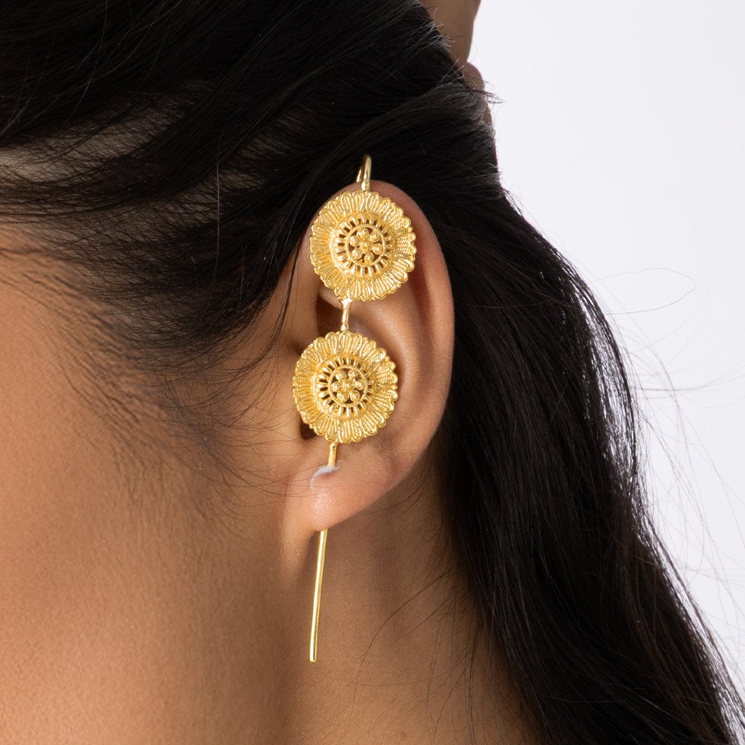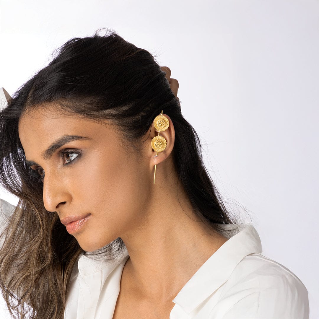 Description: This striking ear climber features two elaborate wheel-like discs with intricate filigree detailing in a bright metal finish. It requires a piercing and elegantly extends up the ear, offering a bohemian and detailed statement.