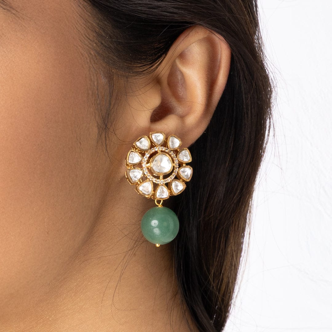Description: These exquisite stud earrings feature a dazzling flower-like arrangement of Polki (uncut) stones in a radiant setting. This classic Indian jewellery design is a timeless choice for online Indian jewellery shoppers..
