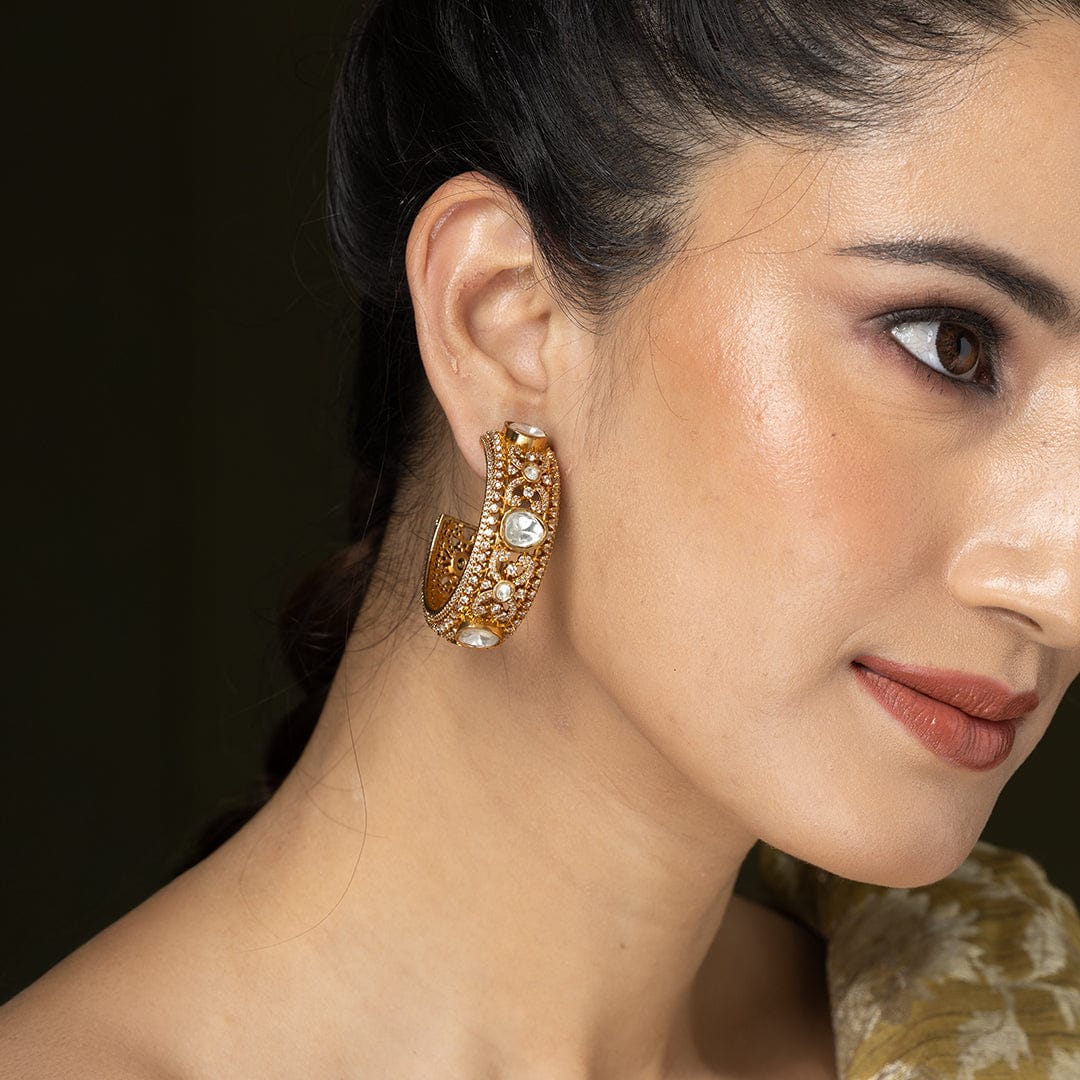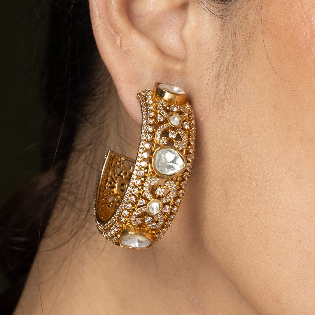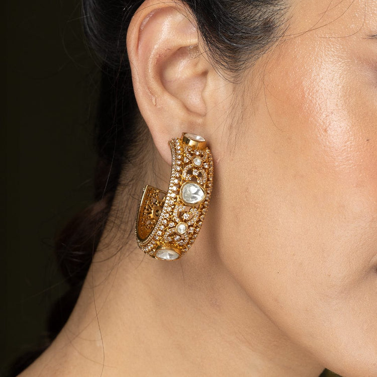 Description: Exceptional, broad ear hoops featuring prominent uncut clear stones meticulously set in ornate metalwork with fine detailing. These captivating pieces possess striking glamour, making them an incredible gift.