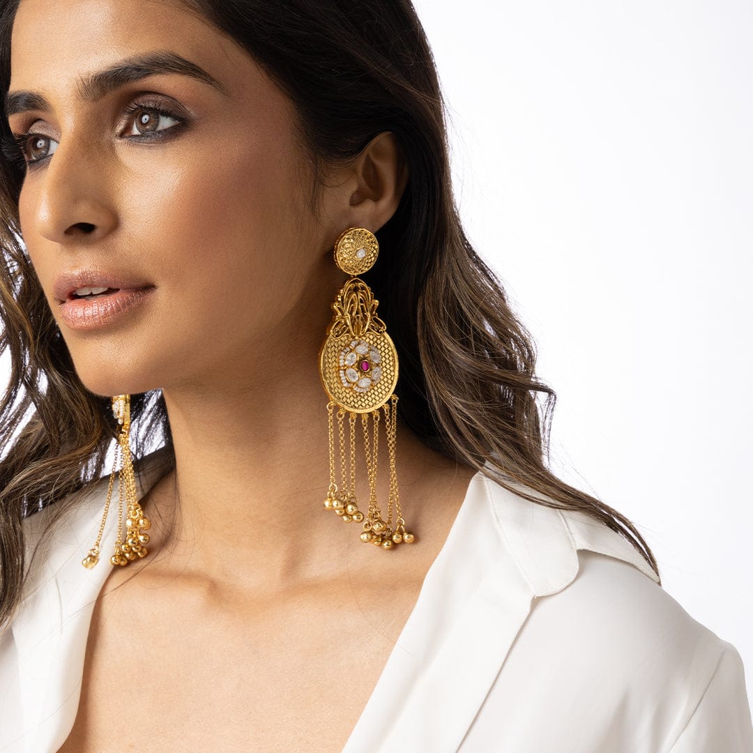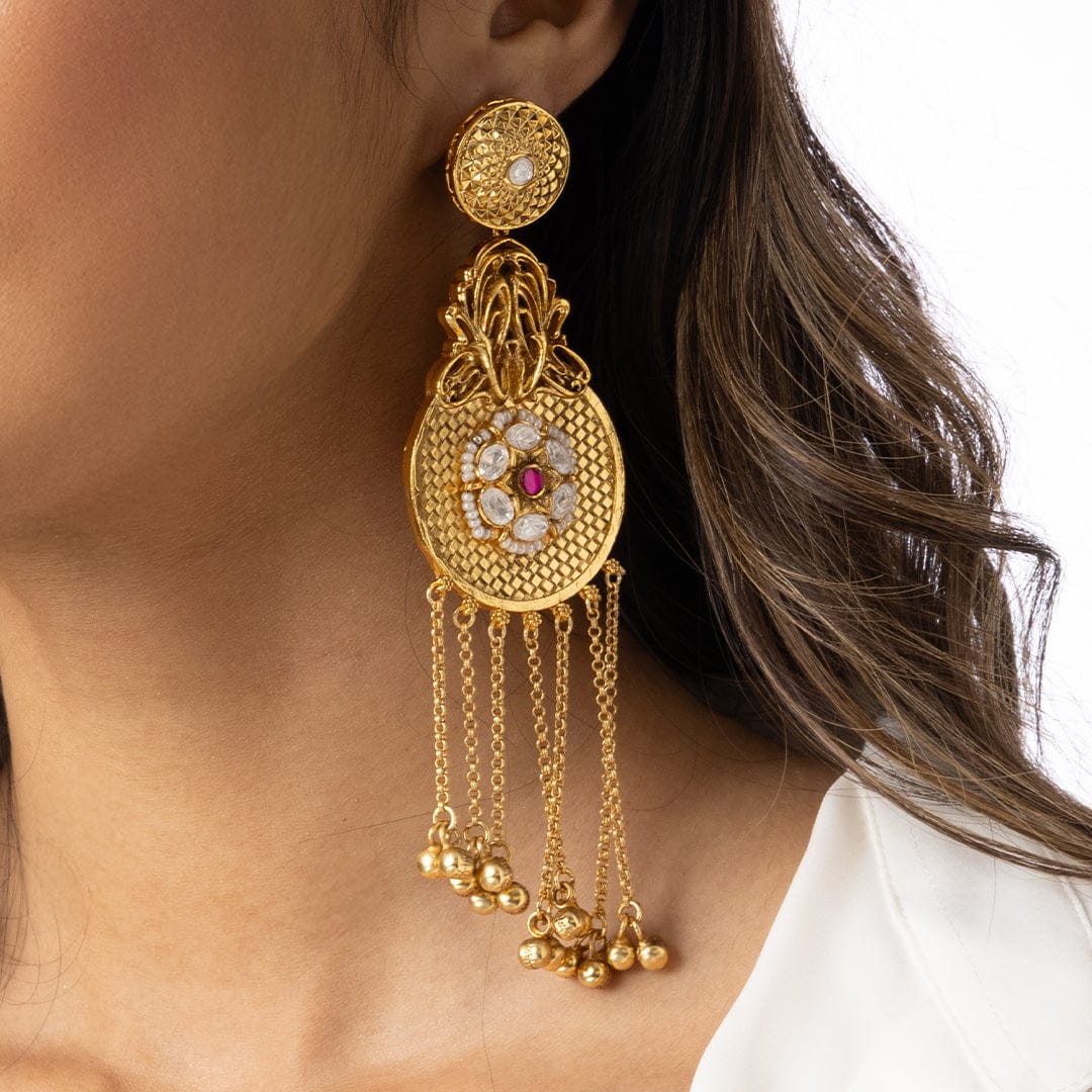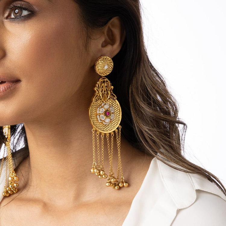 Description: Intricately patterned circular drops with flowing gold chains and bead detailing in traditional earrings. A bold statement piece for weddings, festive styling, and curated online traditional Indian jewellery looks.
