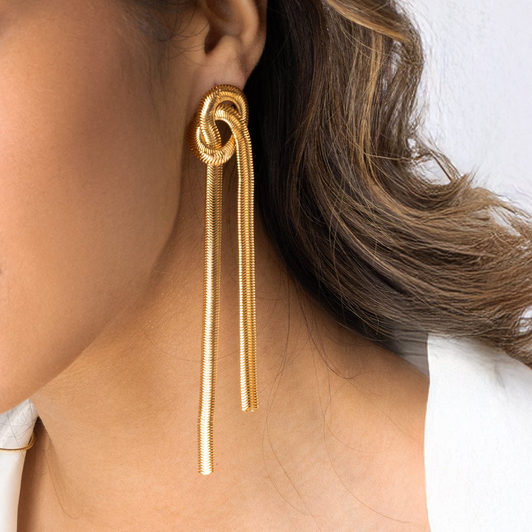 Description: These sophisticated online Indian jewellery earrings feature a stylish knot stud from which long, sleek rods dramatically descend. Their contemporary design offers a fashionable and bold statement look.