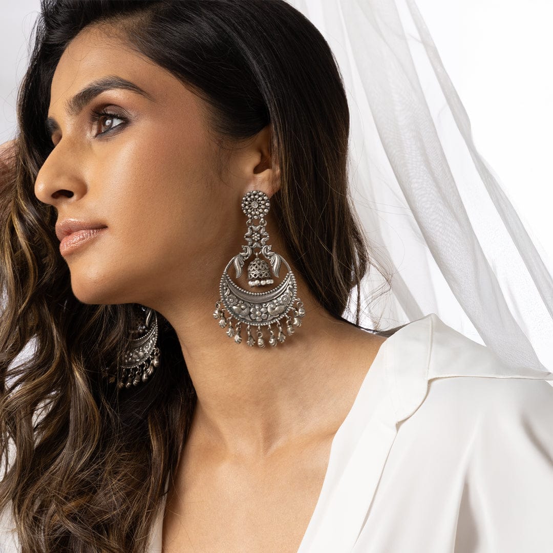 Description: Intricate crescent-shaped earring with detailed engraving and layered hanging droplets, perfect for ethnic outfits, festive styling, and statement looks in online Indian jewellery collections.