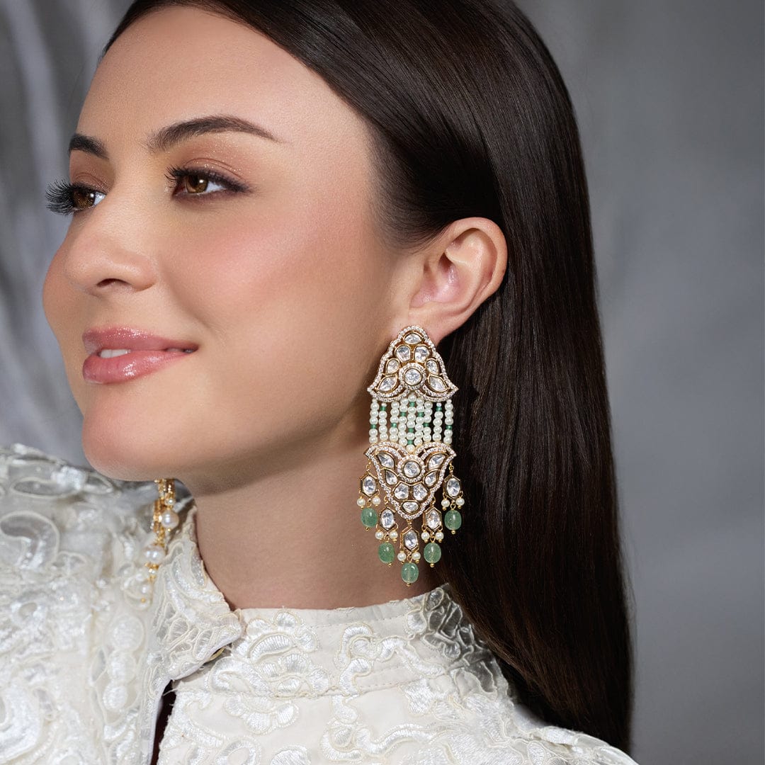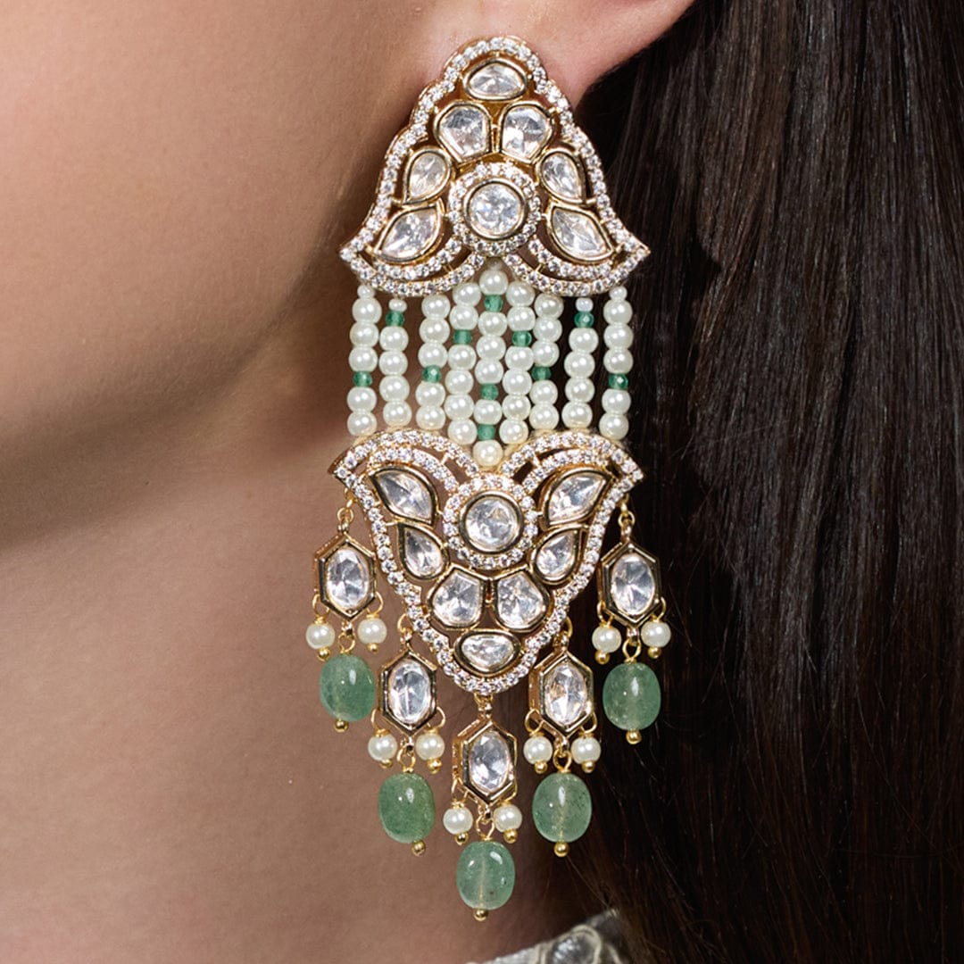 Description: Drenched in regal charm, these earrings feature dazzling kundan tops with pearl strands and green beads. A luxurious choice for weddings, receptions, or royal-inspired celebrations.