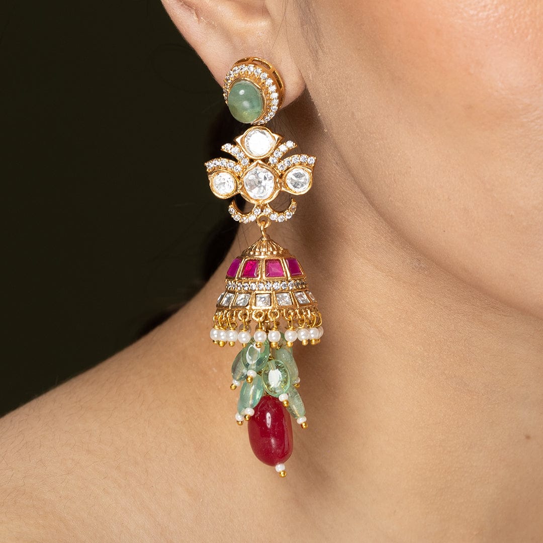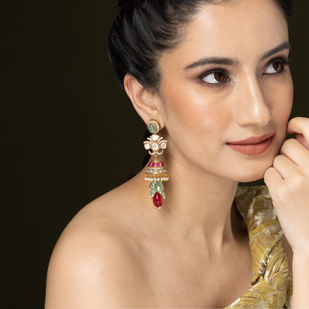 Description: Celebrate tradition with the Ruby Radiance Jhumka Earrings. Adorned with ruby drops, pastel green stones, and delicate gold detailing, these earrings exude cultural beauty and grace. Perfect for bridal wear, festivities, or any special occasion that calls for grandeur.