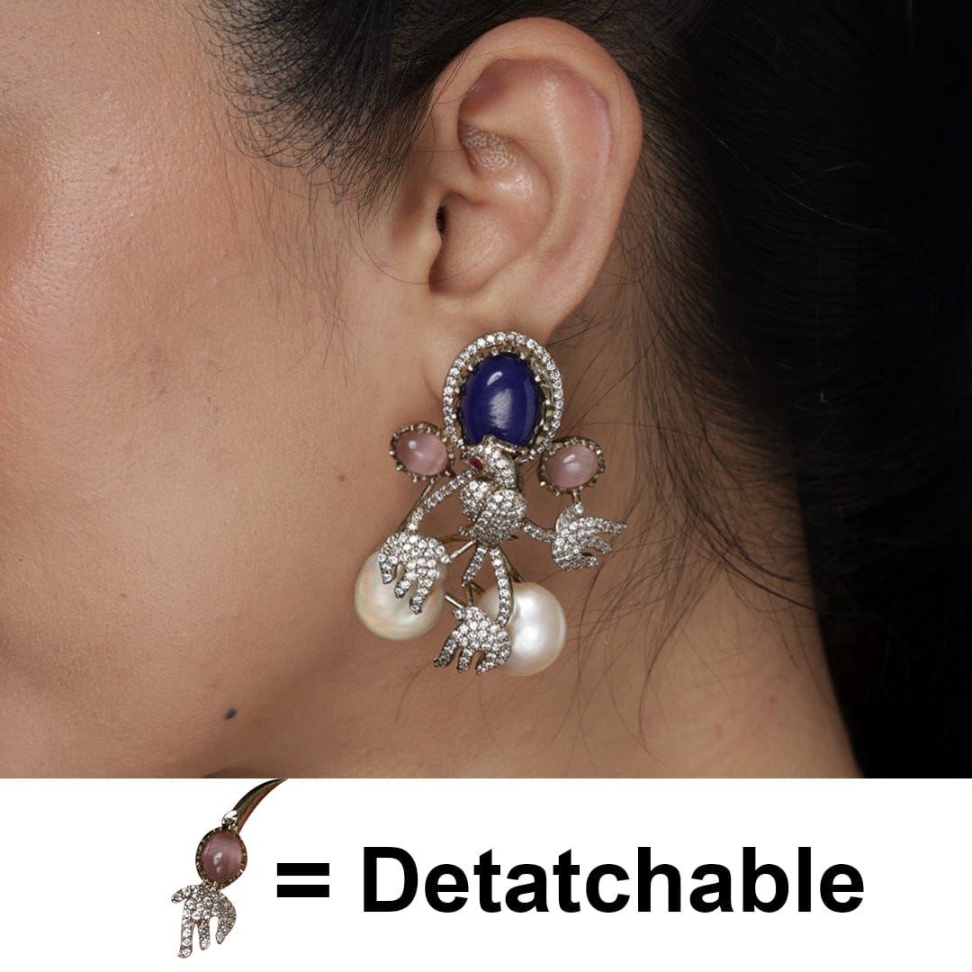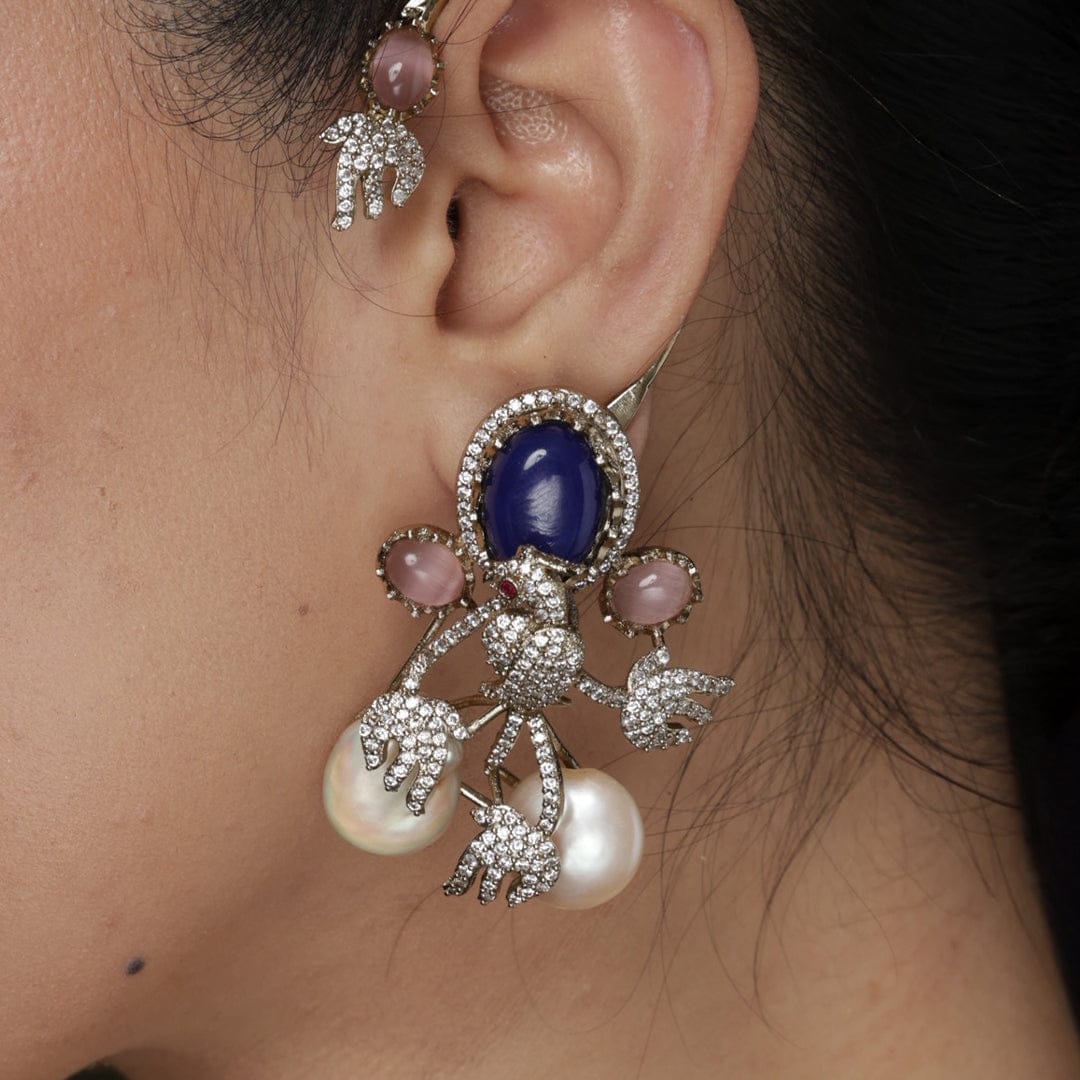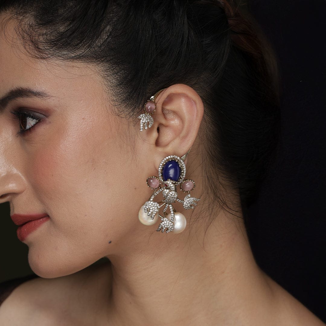 Description: These Sapphire Bloom Statement Cuff Earrings radiate luxury with deep blue stones and gold-toned floral artistry. It can be worn in 2 ways, cuff with & without the drops for different occassions. Designed for bold fashion lovers, they add an enchanting sparkle and elevate your festive or wedding look effortlessly.