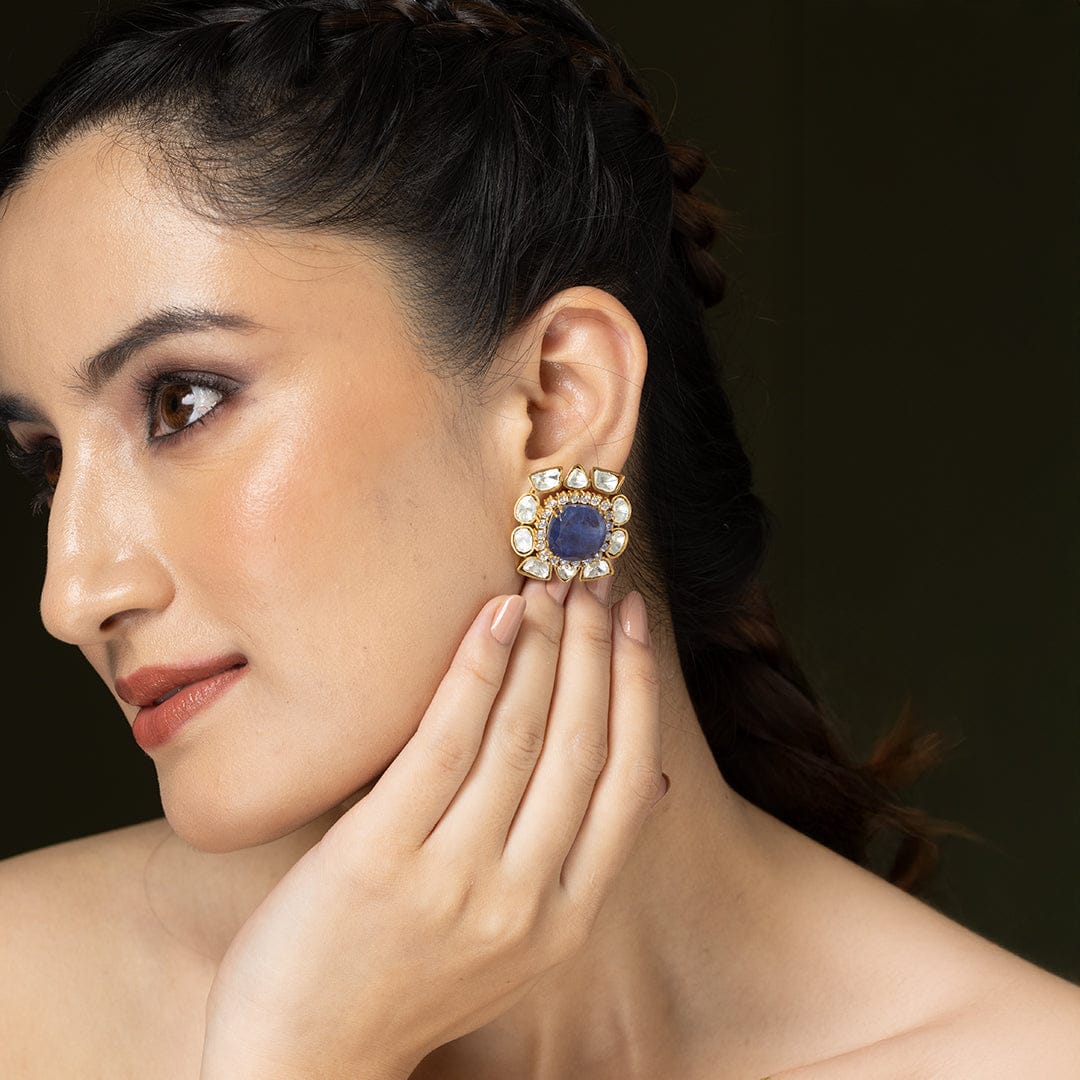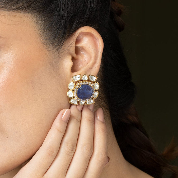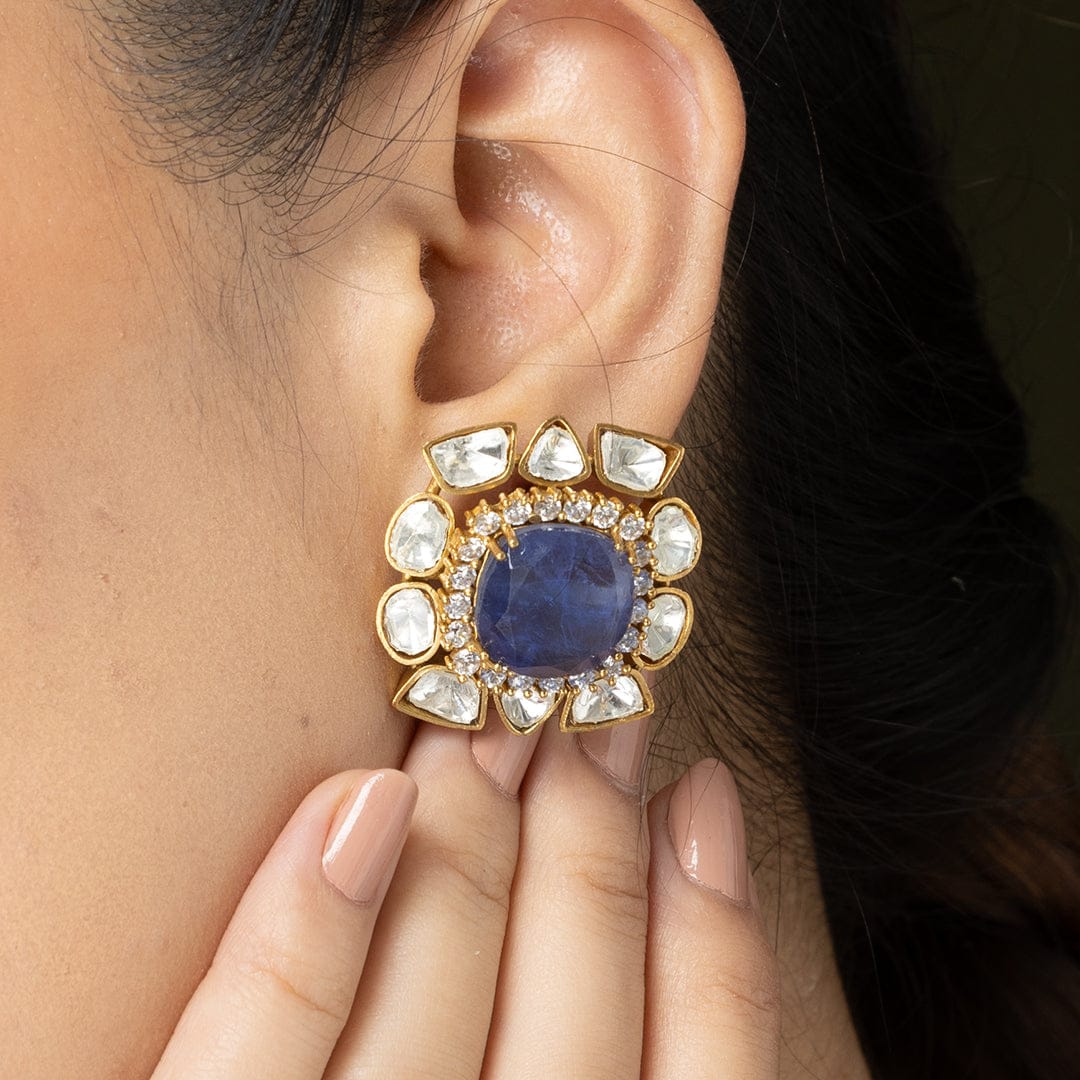Description: Elegant stud earrings showcasing a rich, deep blue central stone surrounded by sparkling clear, uncut stone accents shaped like petals. These gorgeous studs are wonderful for gifting purposes.