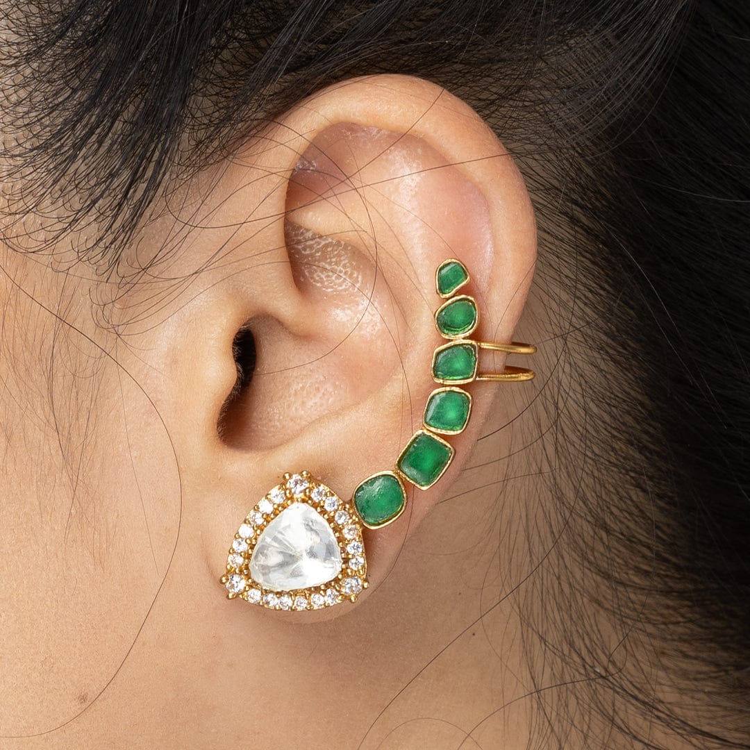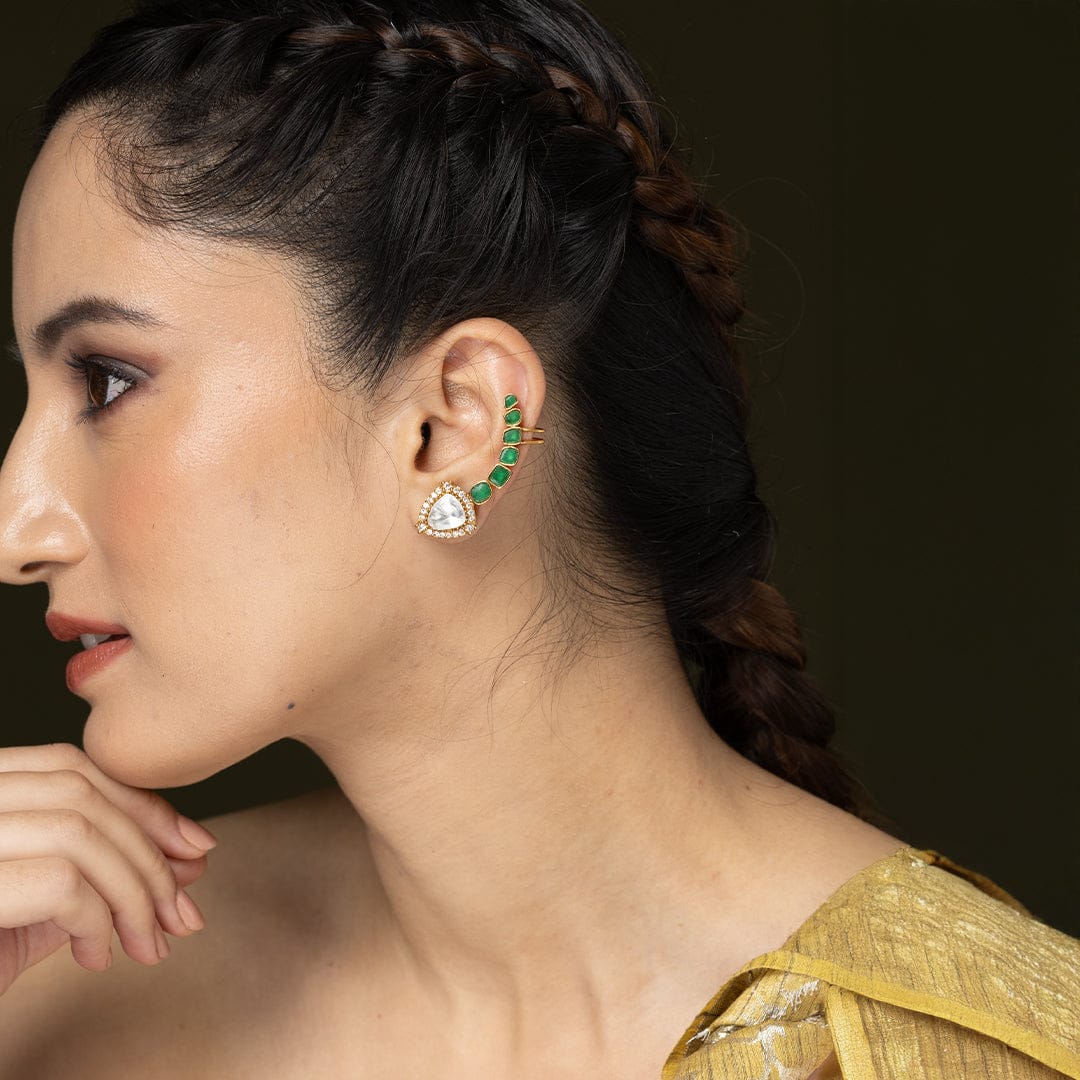 Description: The Serpentine Grace Gold Cuff Earrings blend luxury with modern artistry. Featuring green enamel twists and shimmering stones, they add a touch of bold elegance—ideal for parties, traditional occasions, or statement fashion looks.