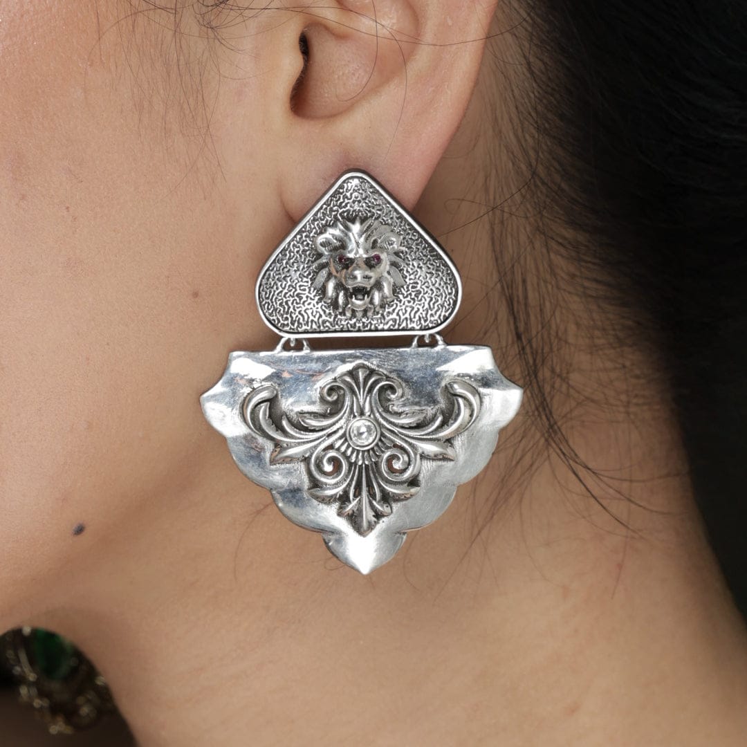 Description: Unique silver-toned dangler earrings showcasing a delicate carved white shell foundation overlaid with intricate metalwork and sparkling accents. An exquisite and memorable choice for gifting purposes.