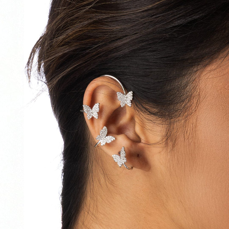 Description: Ahaanya presents a delicate butterfly-themed ear cuff with silver plating, blending modern elegance with Indian jewellery artistry, perfect for enhancing your style and elevating your online Indian jewellery collection.