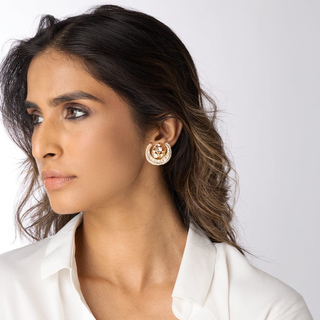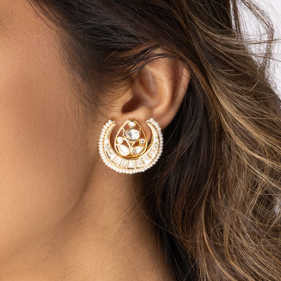 Description: These stunning stud earrings feature a crescent frame embellished with delicate pearls and clear stones. The center highlights a teardrop cluster of clear, faceted stones, creating a traditional Indian jewellery look perfect for online Indian jewellery shoppers.
