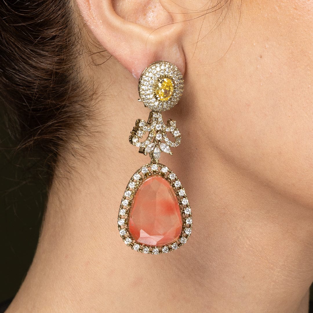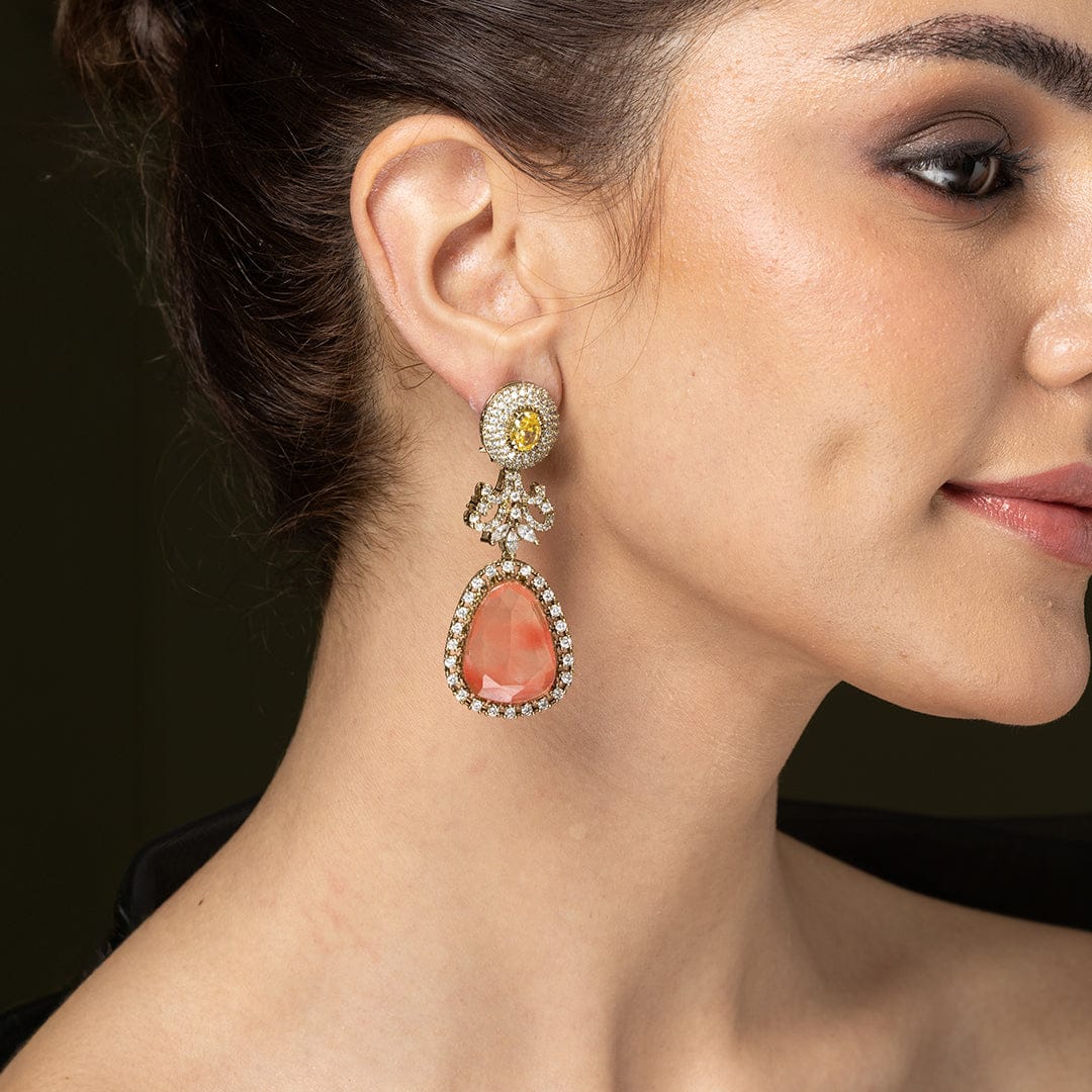 Description: These captivating danglers feature large, vivid reddish-orange teardrop stones suspended from brilliant, clear-accented tops with warm yellow stones. They make a striking and thoughtful gift.