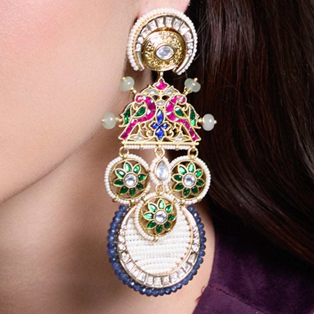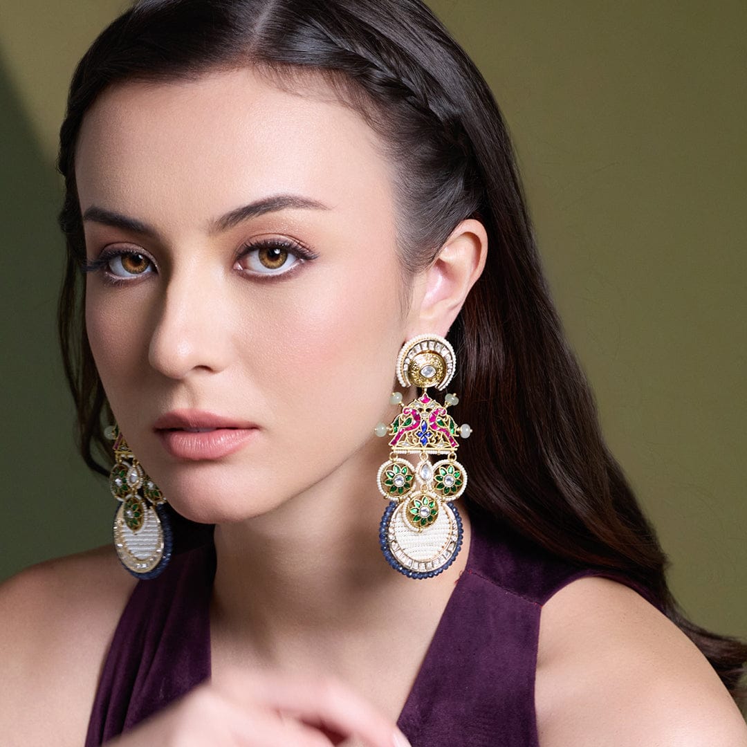 Description: Zayra Meena Dangles Earrings showcase vibrant enamel work, sparkling stones, and intricate detailing. These elegant, colourful pieces elevate your ethnic look with a touch of tradition and sophistication.