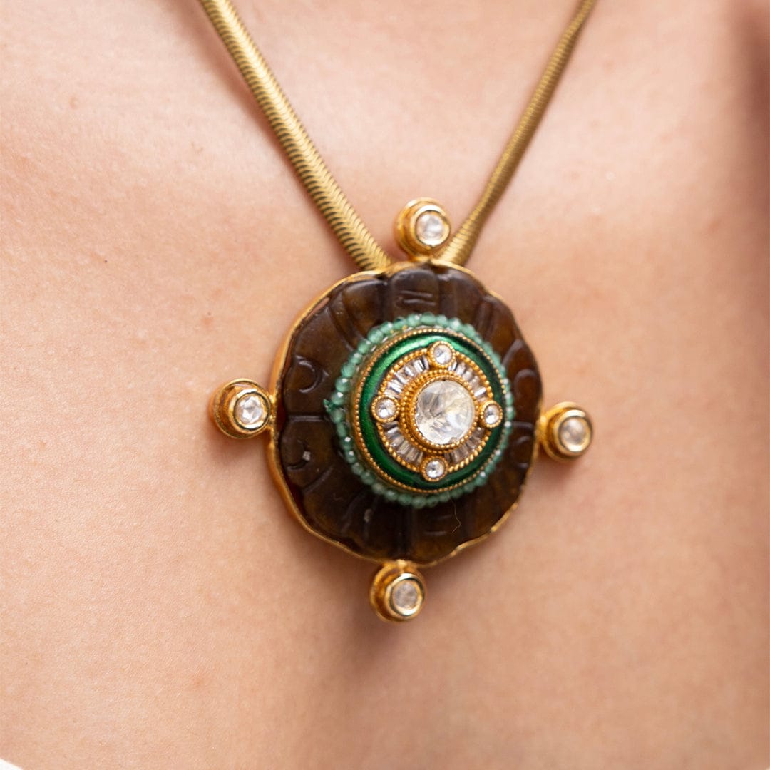 Description: This antique-finish pendant necklace features a circular floral motif with enamel accents in earthy tones. Its artisanal feel and brown-gold palette make it perfect for boho-traditional or ethnic fusion outfits.
