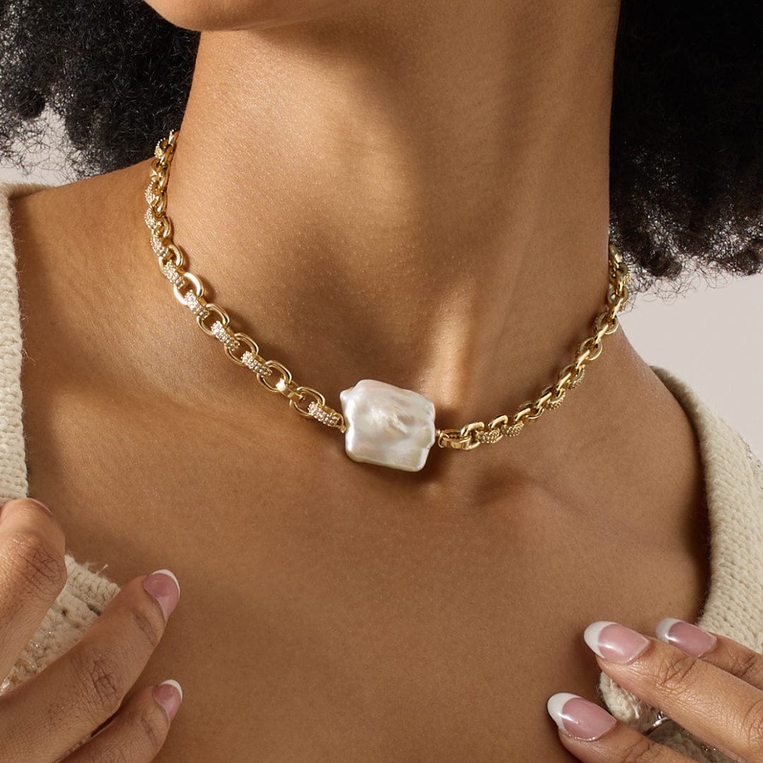 Description: Inspired by divine flow and sacred design, the Aseneth Necklace features baroque pearls draped along a soft pearl-tone chain. Finished with a secure clasp, it blends texture and luminosity with ease. Each pearl brings its own soft strength to the story.