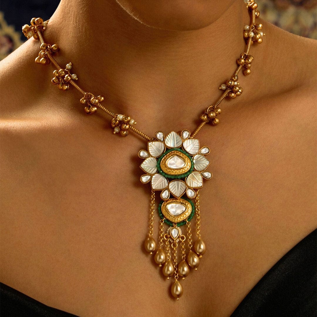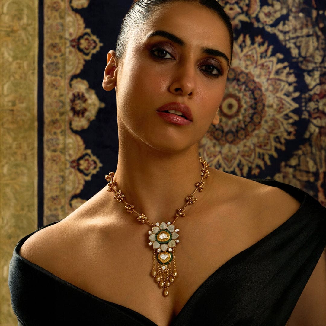 We use 22K Micron Gold Plating on brass, paired with high quality pearls, precious carved beads, semi precious stones, intricately hand painted with enamel, exquisite high quality pearls and high quality kundan that are celebrated for their durability and refinement - making every Joules by Radhika creation a piece that radiates brilliance and sophistication.