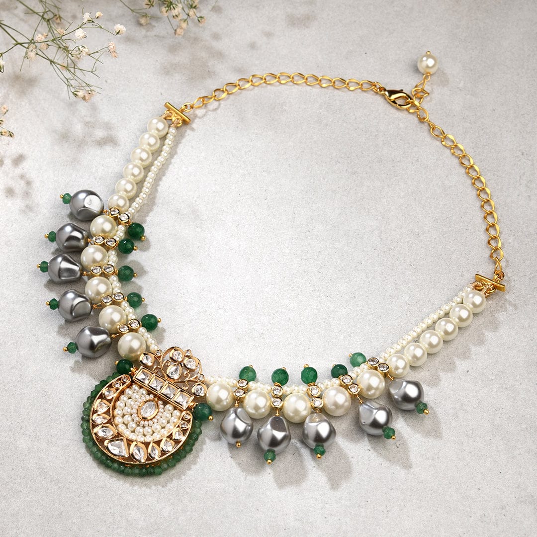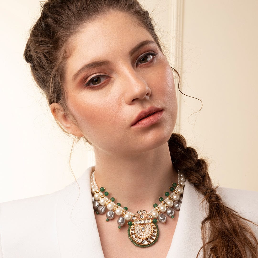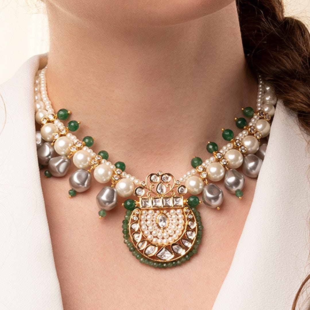 Description: Bespoke Necklace With Pearls & Agate" features signature style with white and grey pearl beads, drops, green agates, and rich kundan polki. Perfect for festive, wedding, and party occasions, this Indian-fusion necklace from Joules by Radhika radiates regal elegance with real semi-precious stones.
