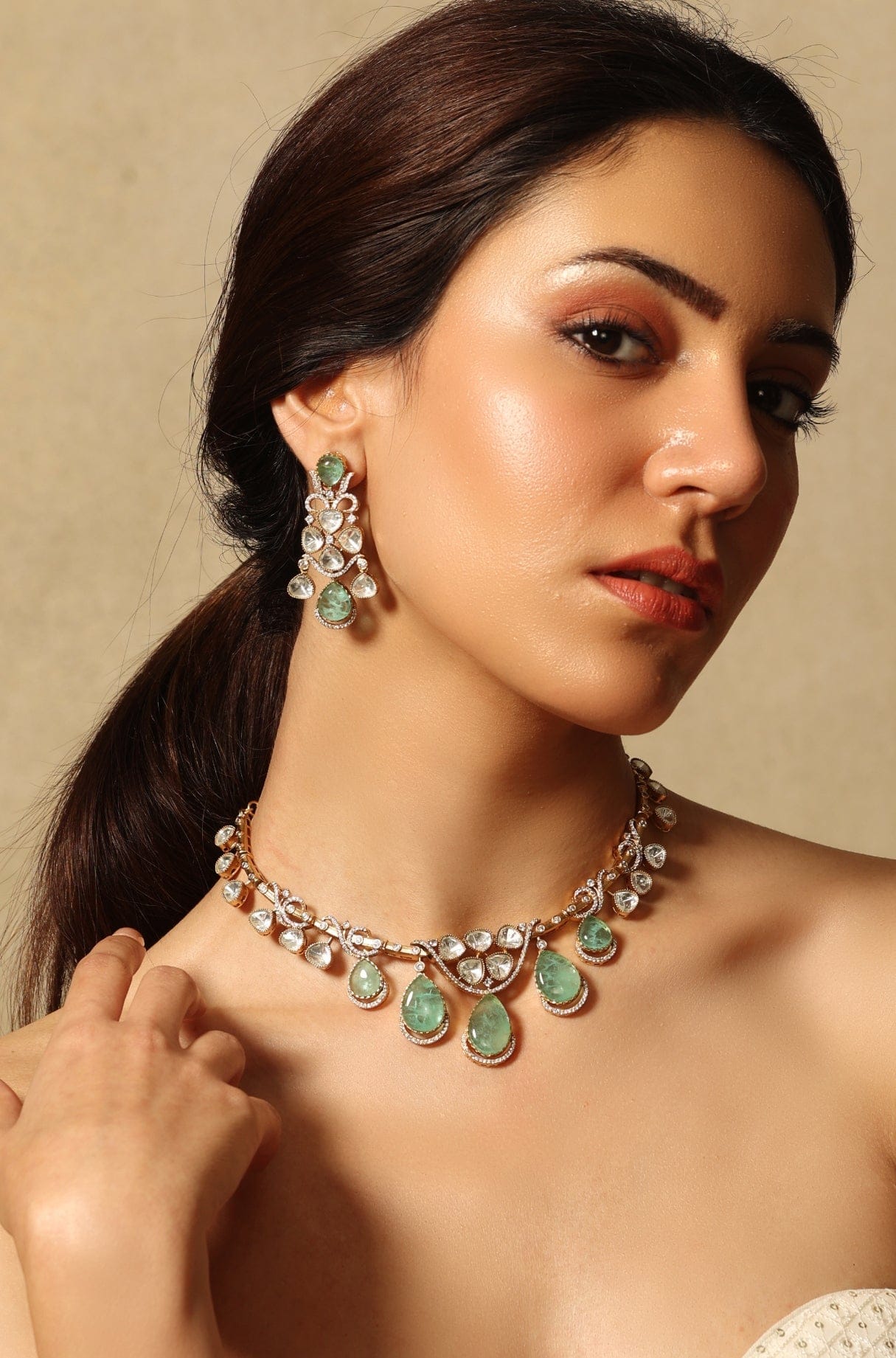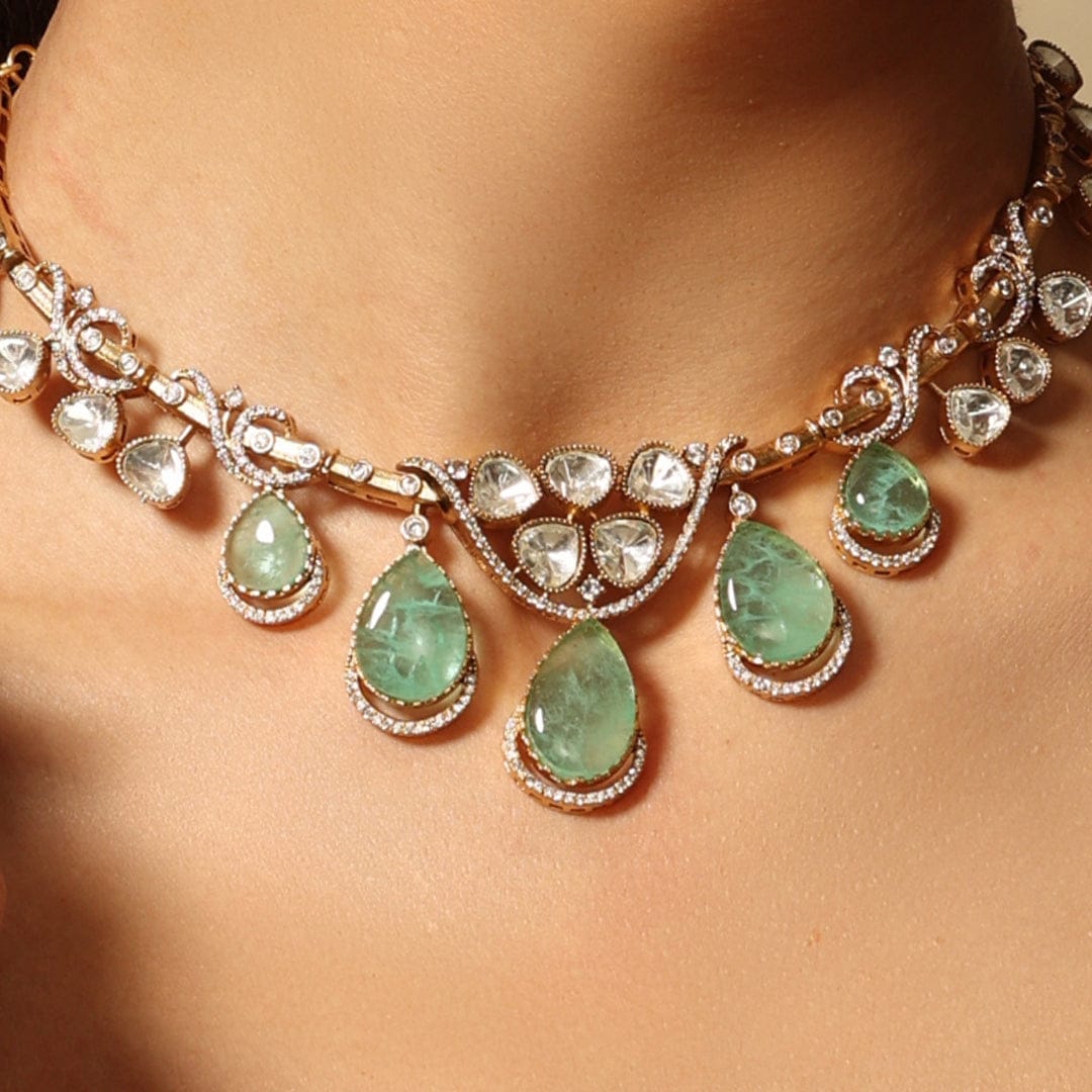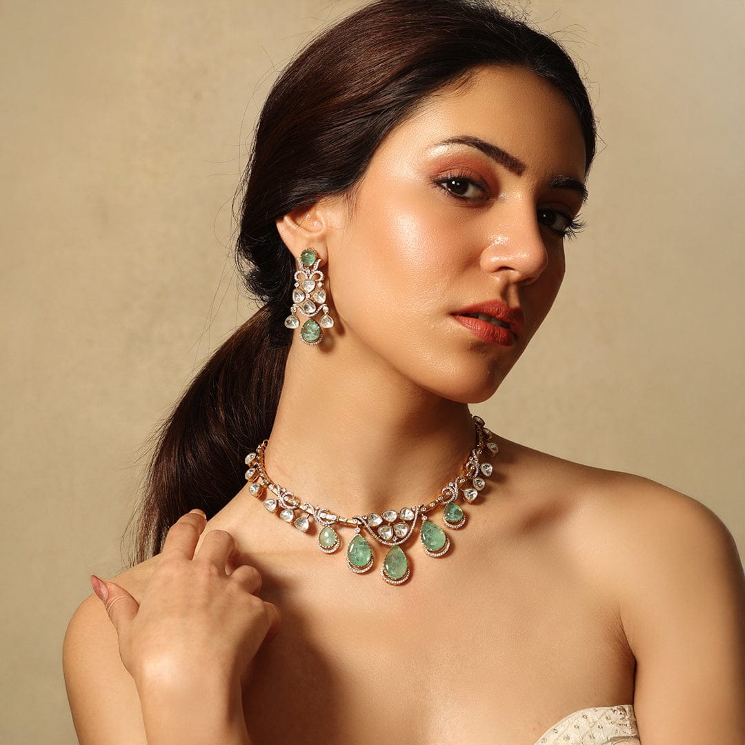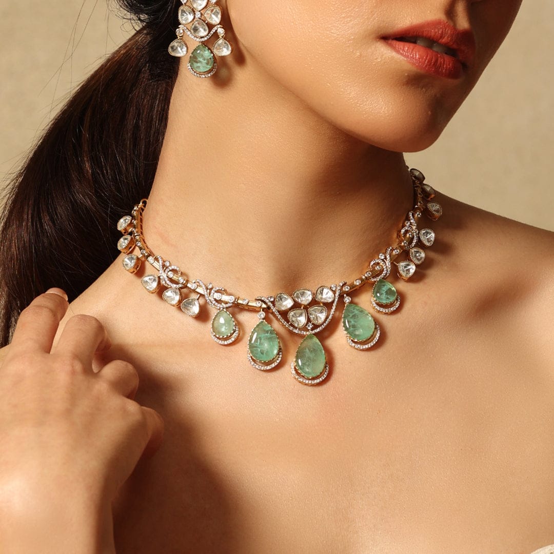 Description: A delicate gold chain peppered with verdant teardrop gems that dance gracefully with motion, paired with matching earrings to form a unified ensemble exuding quiet refinement.