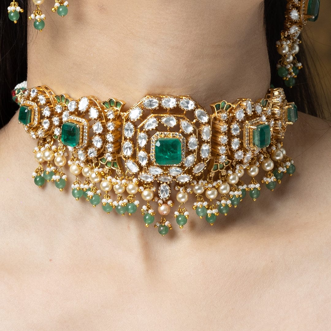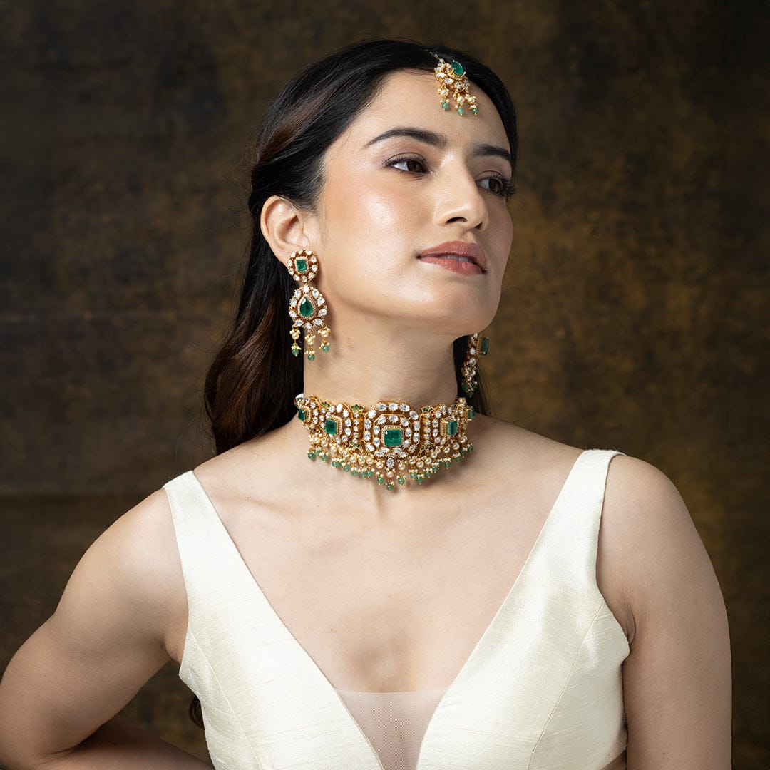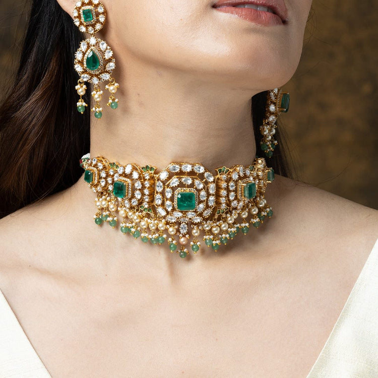 Description: This beautiful ShopJBR choker necklace set features a detailed floral pattern accented with sparkling green stones. A cascade of delicate pearl drops lines the base. The set includes simple, elegant matching stud earrings.