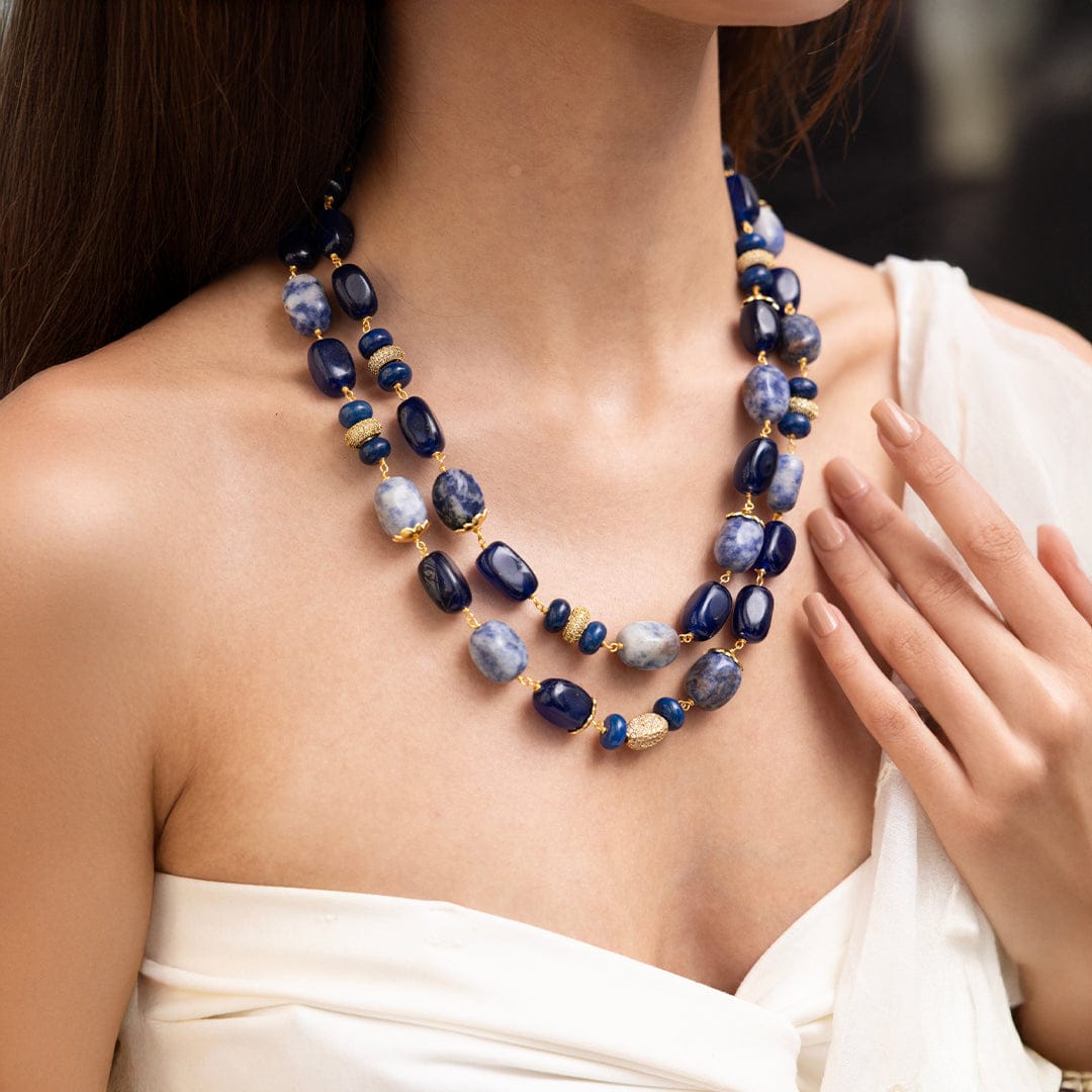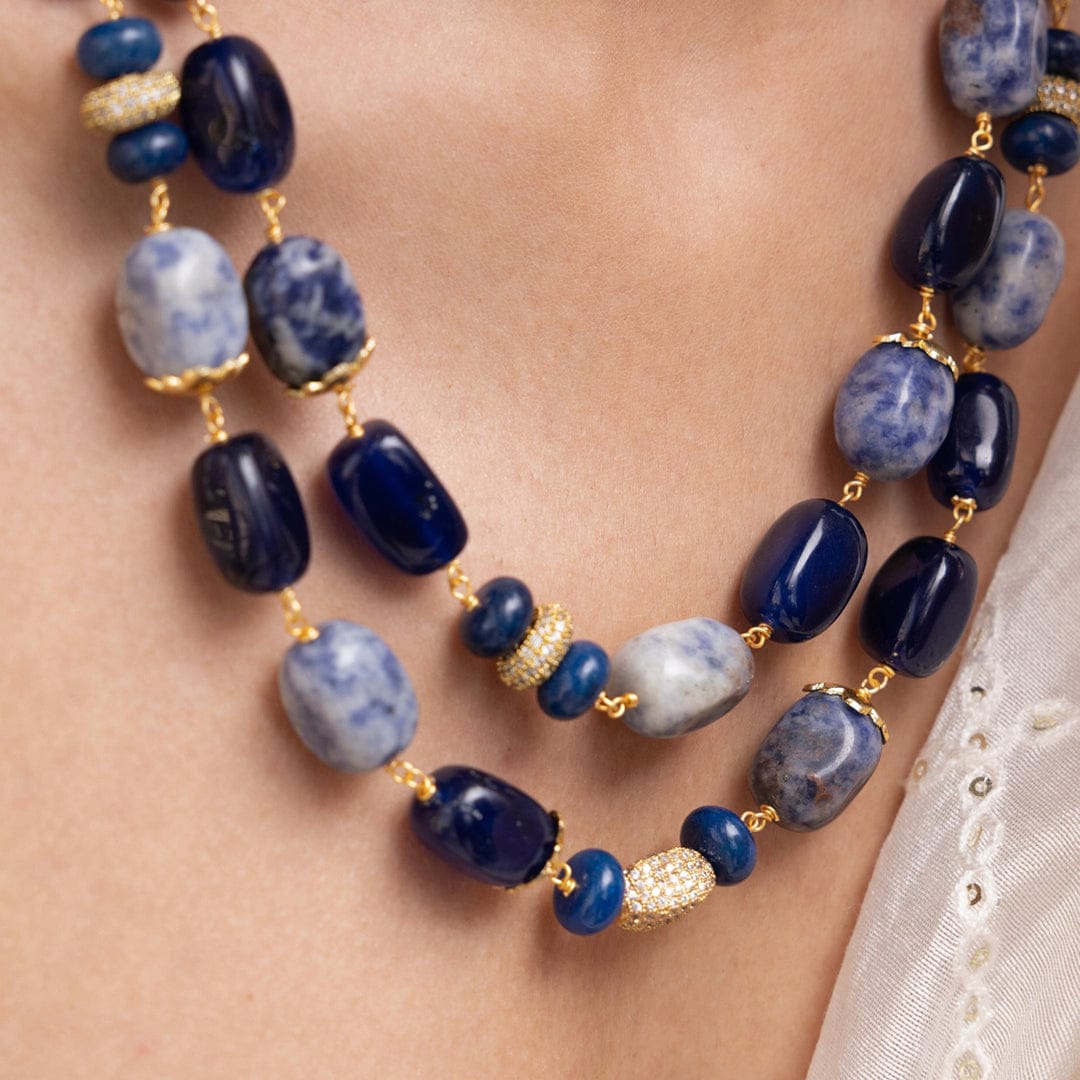Description: Bold navy-blue beads meet sleek gold links in this layered necklace thats full of depth and movement. A statement-maker for cocktail sarees, Indo-western gowns, or contemporary festive edits.