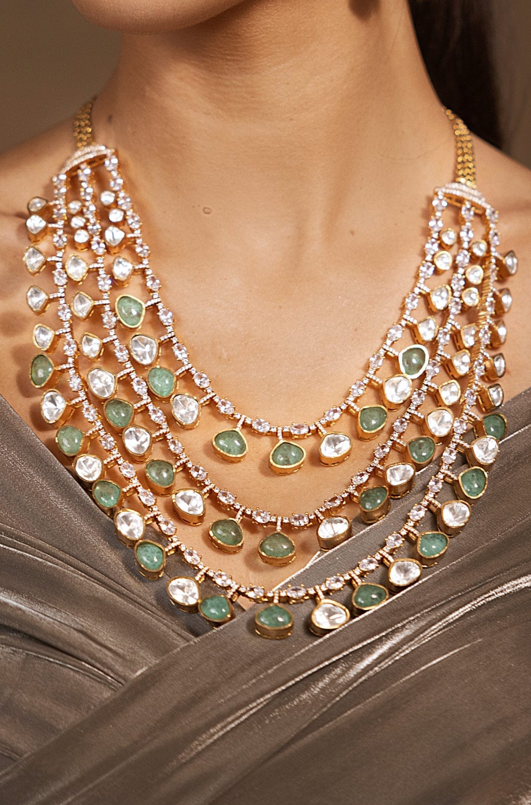 Description: A luxurious necklace set featuring golden and green stones, made of brass with yellow plating. Lobster lock with links closure.