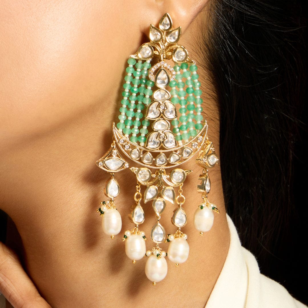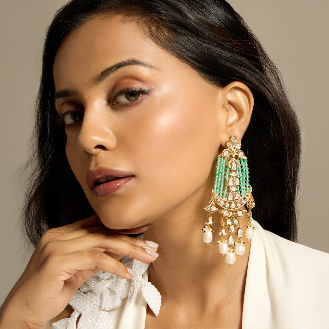 Regular price Rs. 7,088.00Description: Pearl Garden Dangles bring together the classic allure of polki and pearls with a fresh touch of green beads. These earrings offer a perfect blend of tradition and modern elegance, with pearls gently cascading from a polki-studded base and vibrant green beads adding a lively finish. Ideal for both festive celebrations and formal events, they are designed to enhance your look with grace and charm.