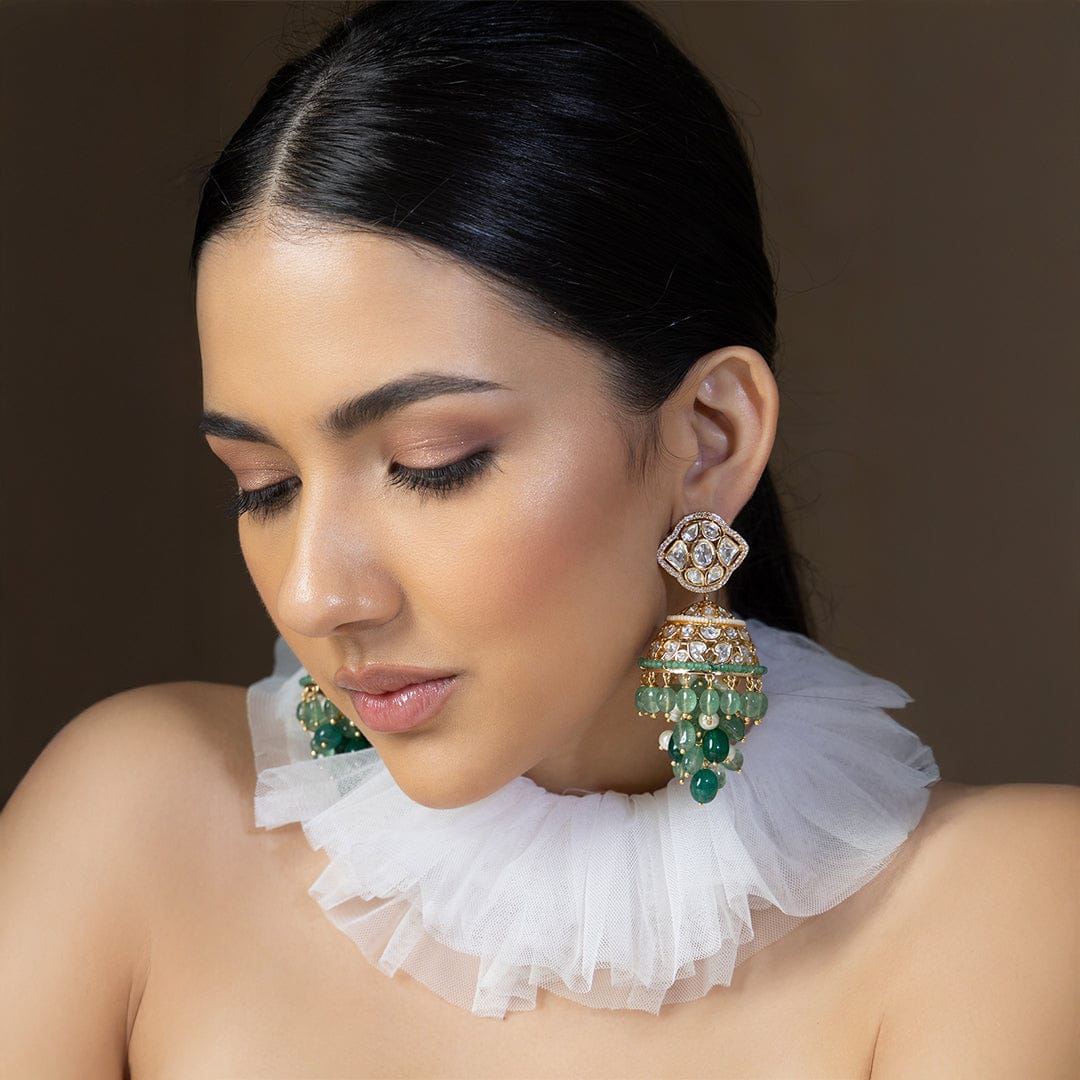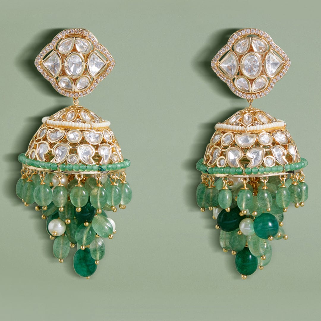 Description: Celebrate every occasion in style with Polki and Green Beads Jhumka Earrings in 22KT Gold Plating. Adorned with enchanting hydro polkis, captivating strawberry quartz, lustrous pearls, and alluring green agate beads, these earrings add a touch of elegance to weddings, parties, festivals, or personal milestones.