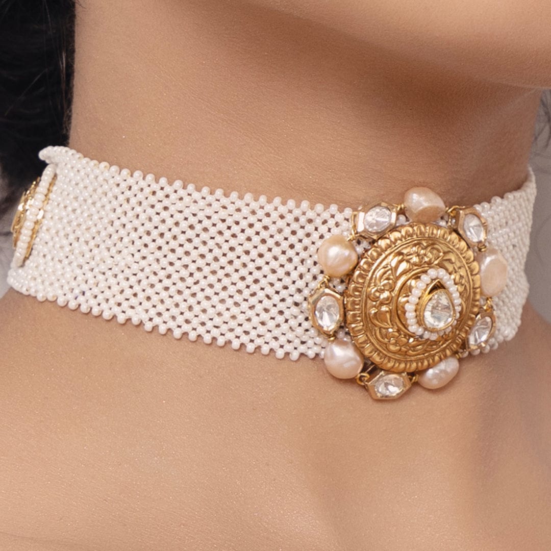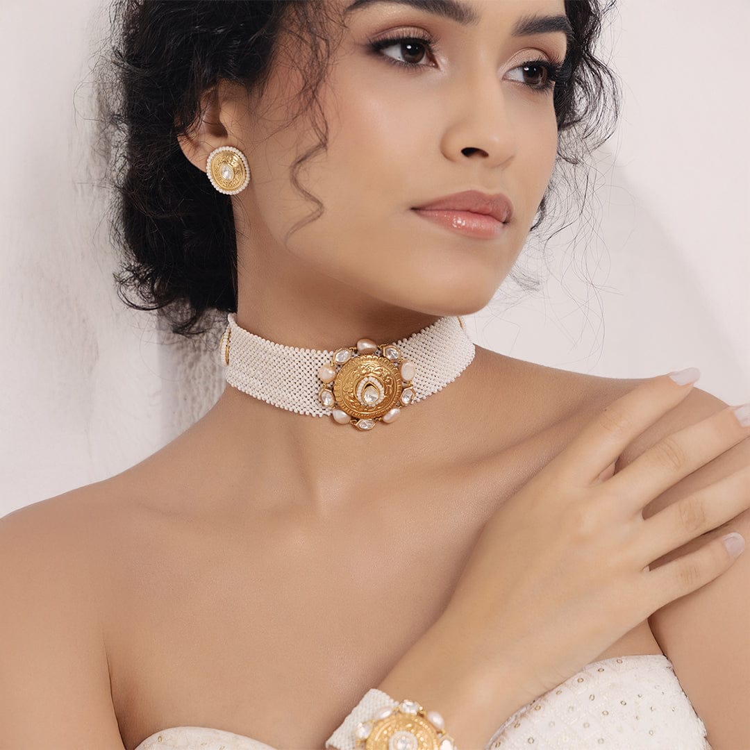 Description: An elegant choker necklace set crafted from brass with a yellow gold and white plating.