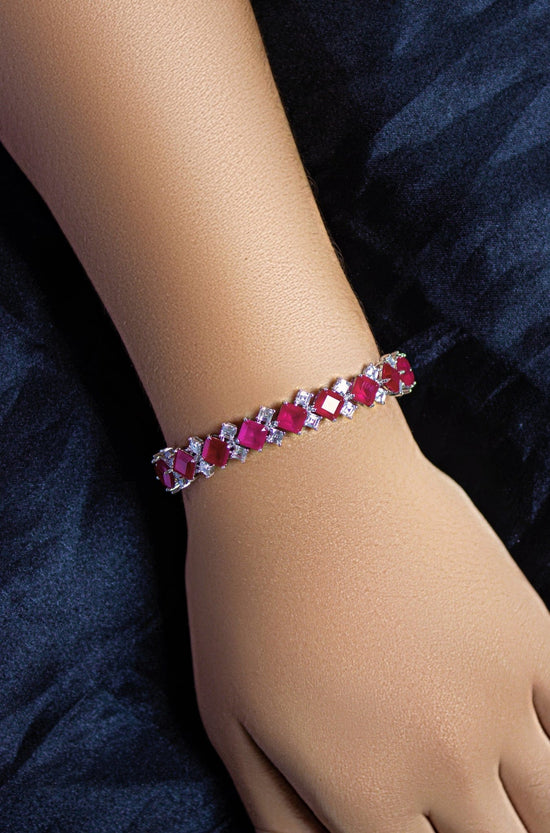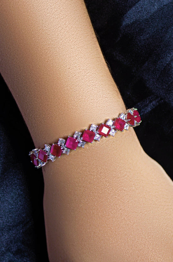 Description : Deep red gemstones, reminiscent of royal heirlooms, shimmer with an untamed intensity against a silver base. Accentuated by white AD diamonds and secured with an open box clasp, this bracelet is a bold symbol of strength and elegance